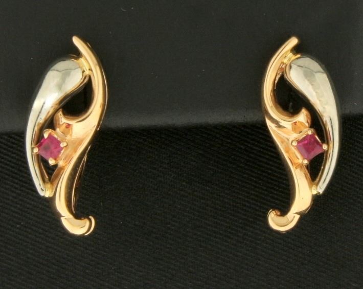 In 14k white and yellow gold. Each earring contains a natural square shaped 2.2mm ruby gemstone with a beautiful red color and excellent clarity. 3/4 inch long. 5.3g.