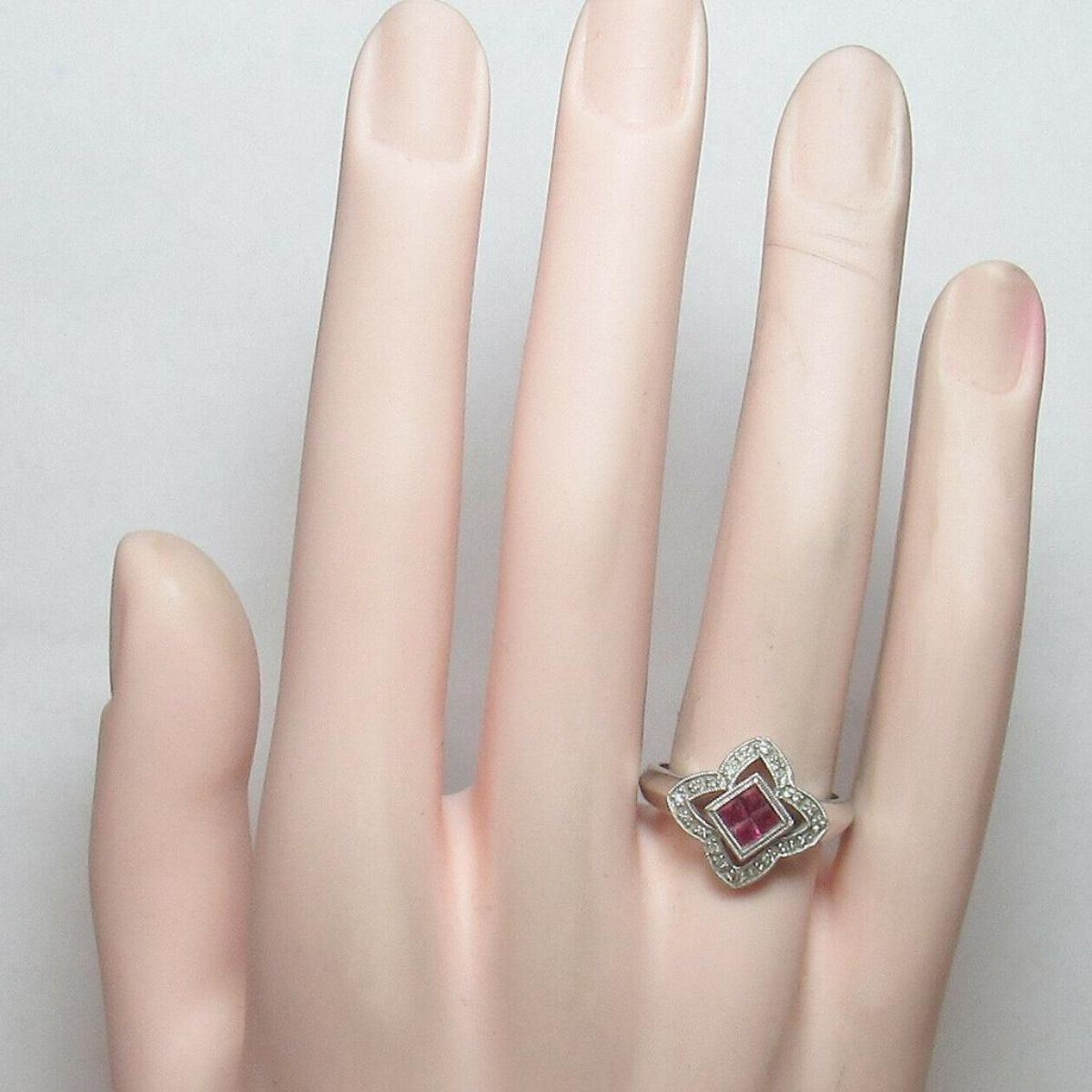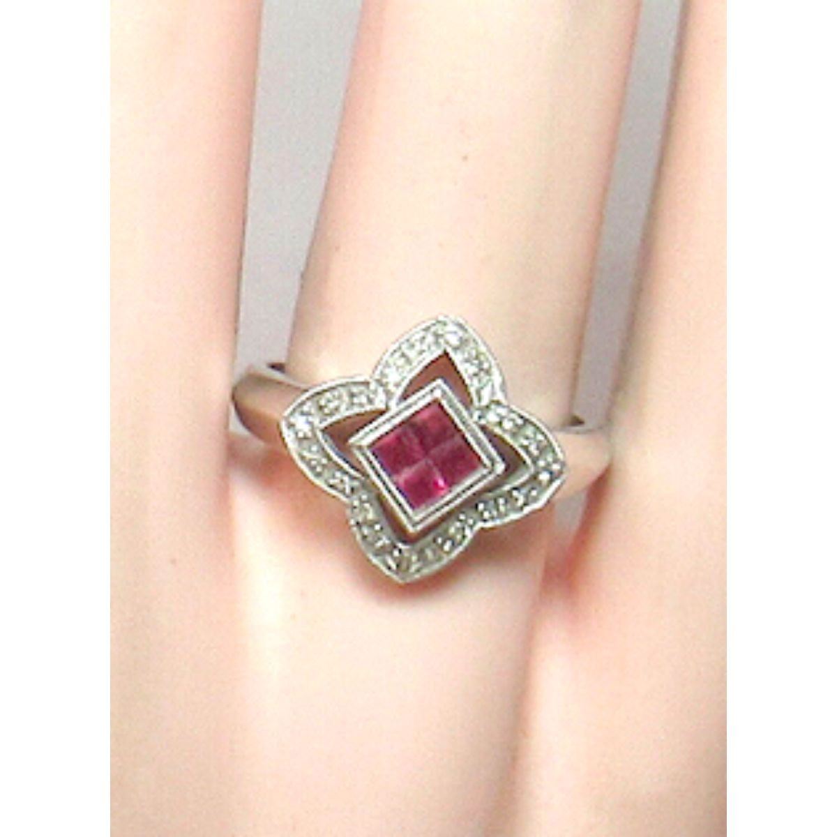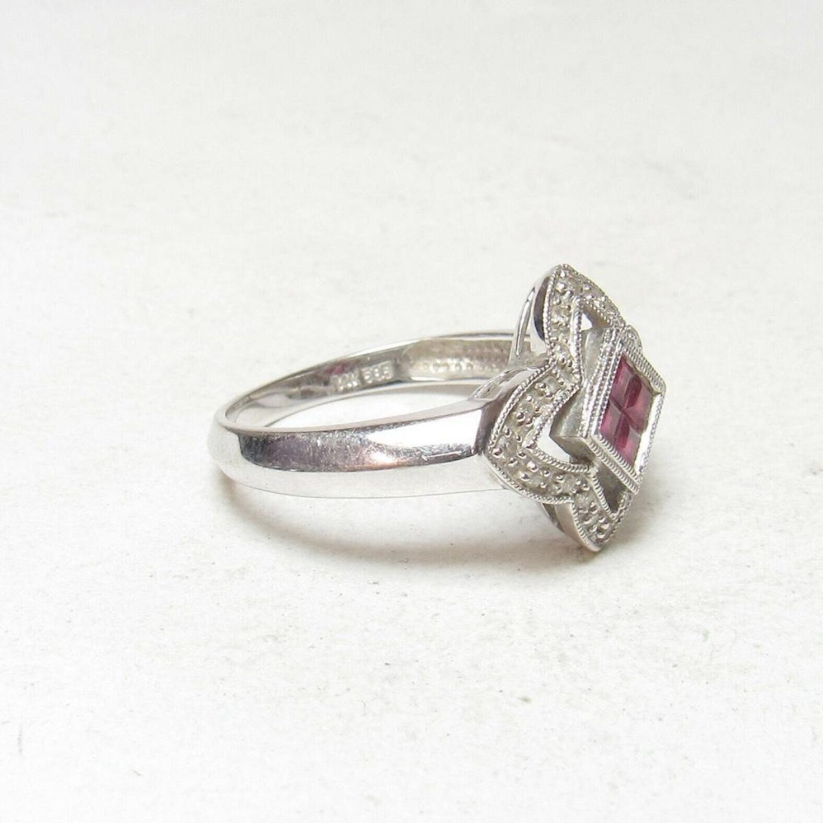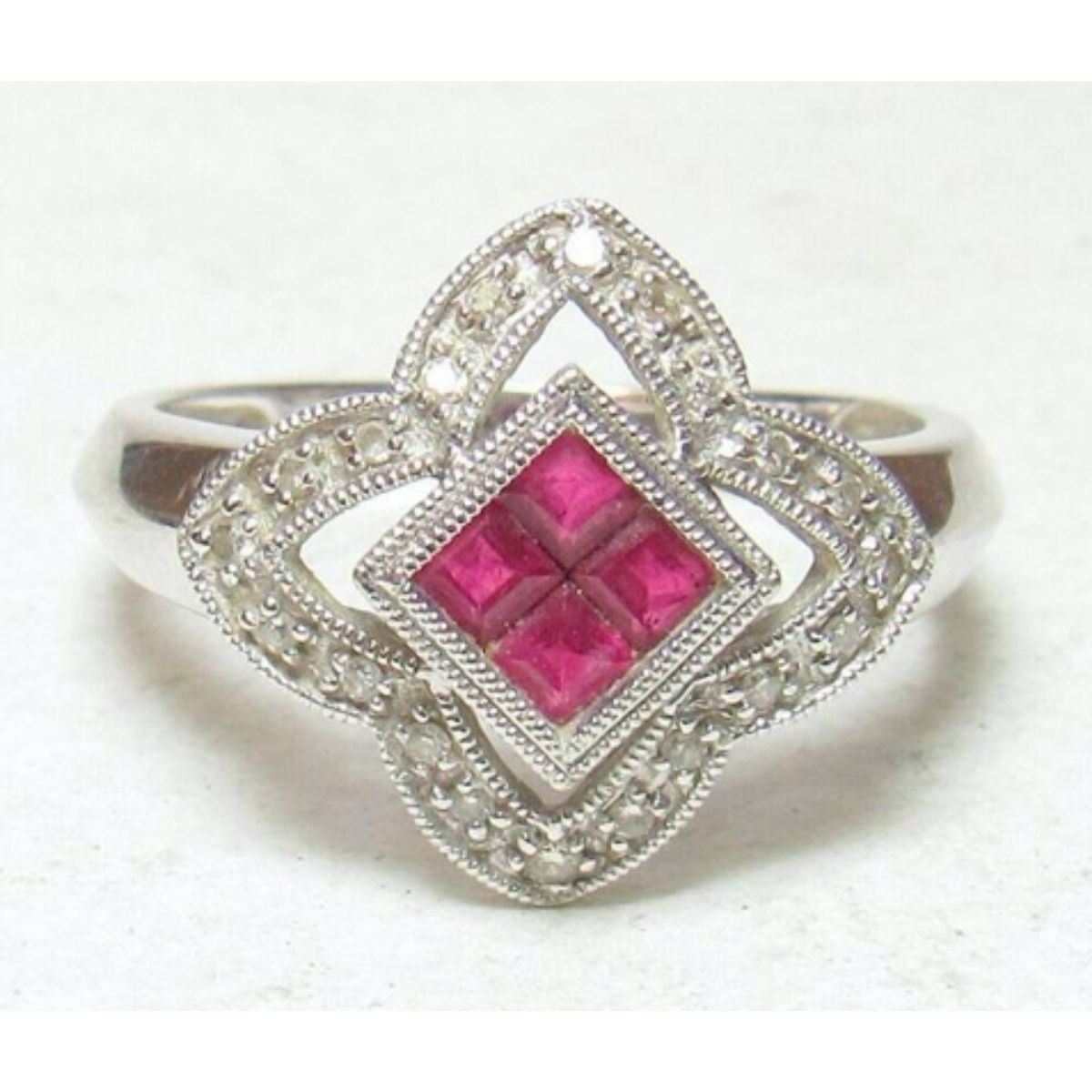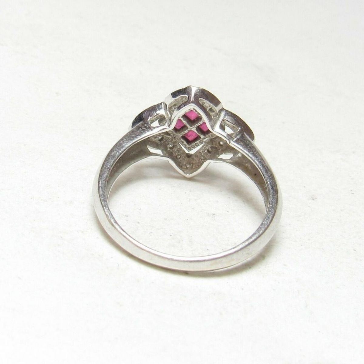 Ruby & Diamond 14kt Gold Cocktail Ring, with .30cts princess-cut scarlet red ruby gemstones ( some internal inclusions ), & 20 brilliant-cut diamonds ( I1 clarity & I in color ) with approx total weight of 0.15cts, set into 14K white gold ( marked ) ring. Size 7.25
