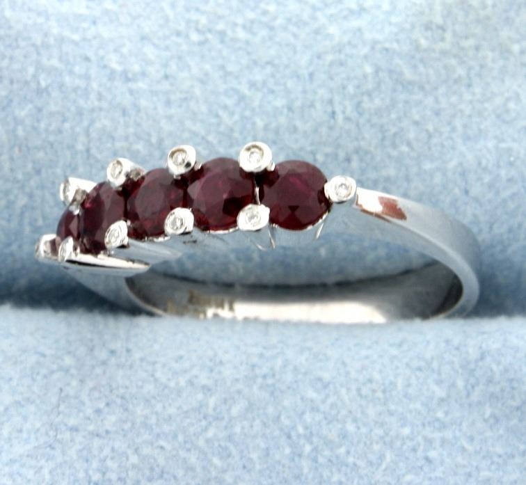 Fantastic Ruby & Diamond band in 14k white gold. The 5 round gem Ruby total approximately 1.31 carats that are accented with 10 gem diamonds that weigh a total of 0.04 carats. Perfect style--this is a new ring! Size 7 1/4 3.9g
