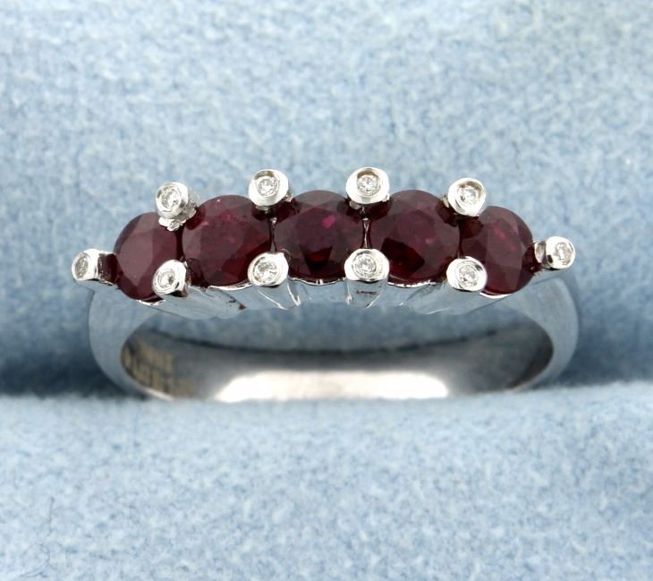 Fantastic Ruby & Diamond band in 14k white gold. The 5 round gem Ruby total approximately 1.31 carats that are accented with 10 gem diamonds that weigh a total of 0.04 carats. Perfect style--this is a new ring! Size 7 1/4 3.9g