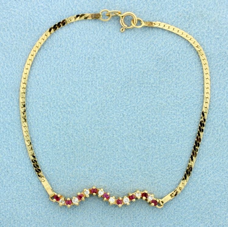 In 14K yellow gold, it is 6 1/2 inches long and contains nine .02ct round rubies as well as eight .02ct round diamonds. Flat S link chain.  This bracelet has a lobster clasp.        2.2g