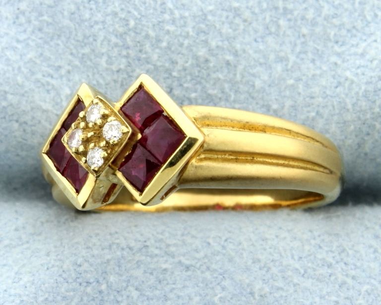 This Ruby & diamond 18k yellow gold ring is exceptional! There are six square gem Rubies and four diamonds set into this Deco style ring. The diamonds total 0.05 carats, SI clarity and H color. The Rubies are red, no pink, beautiful blood red! Stunning piece! Size 6 1/2 5.3g