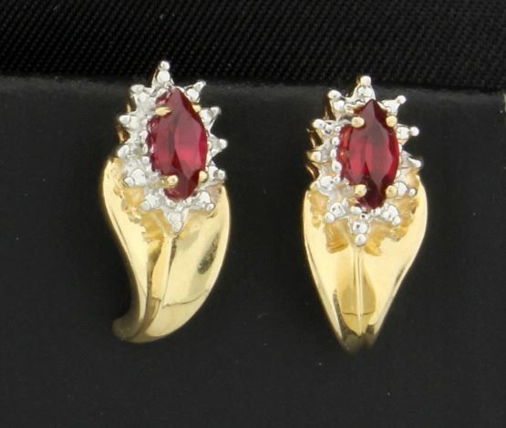 In 14K yellow & white gold, each earring contains a .30ct marquise ruby gemstone and two 1/2pt diamonds. They have friction backs and are 5/8 inch long. 2.9g