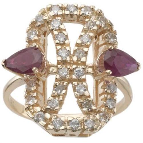 <B>Ruby, Diamond, Gold Ring</B></I><BR><BR>The ring features pear-shaped rubies weighing a total of approximately 1.00 carat, enhanced by full-cut diamonds weighing a total of approximately 0.45 carat, set in 14k yellow gold. Gross weight 5.60 grams. <BR>*Note: Size 6 (sizeable) <B>Condition Report:</B> Good condition.<BR><BR><b>Shipping:</b> Miscellaneous Collectibles, Smal (<a target="_blank" href="http://www.heritageauctions.com/common/shipping.php">view shipping information</a>)