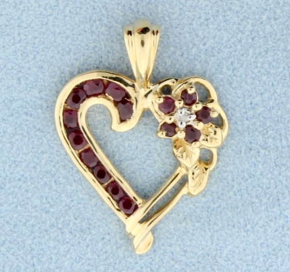 In 10K yellow gold, this 1 inch long pendant contains one 1/2pt diamond, five 1.6mm & ten 2mm round rubies-approximately .40ct total weight-with deep red color! 2.4g