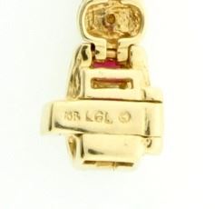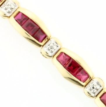 In 10K yellow & white gold, it is 7 1/4 inches long and 5.6mm wide. It contains thirty 2mm & fifteen 3mm square rubies, for a total weight of 4cts, excellent color and clarity. Also there are seven 1/2pt diamonds. This bracelet has a safety clasp. 13.4g