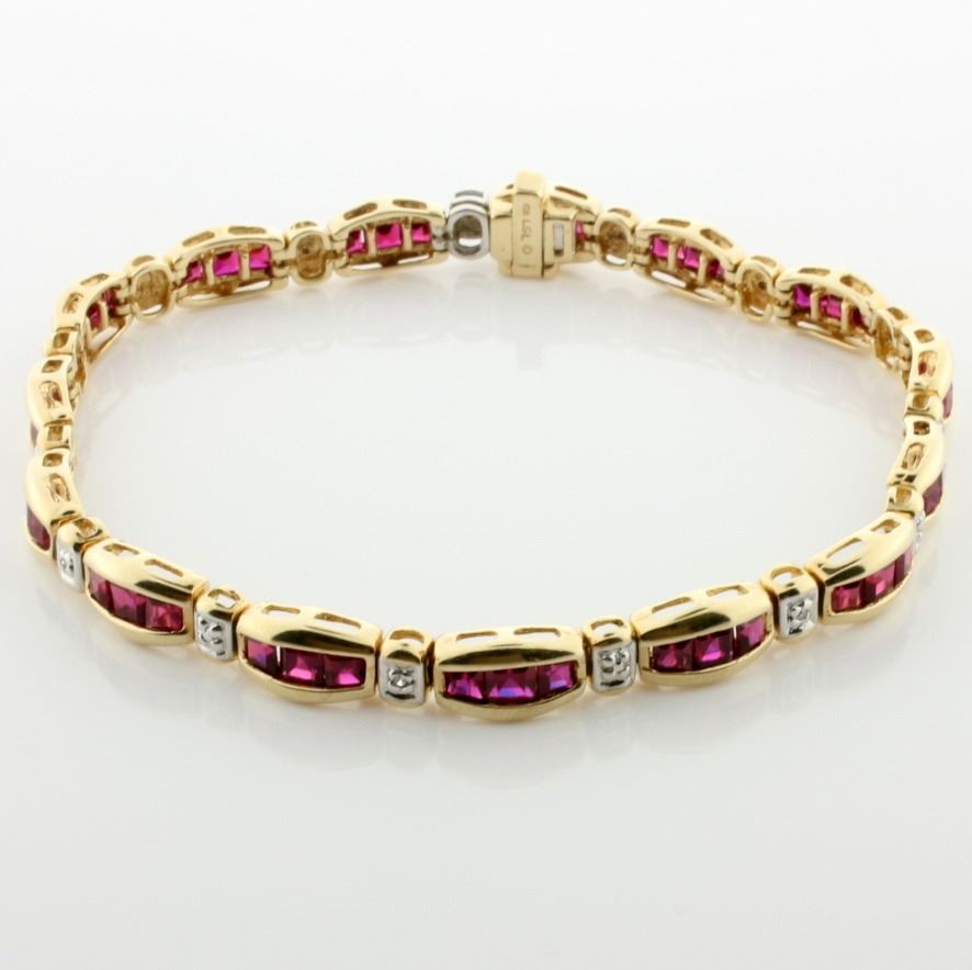 In 10K yellow & white gold, it is 7 1/4 inches long and 5.6mm wide. It contains thirty 2mm & fifteen 3mm square rubies, for a total weight of 4cts, excellent color and clarity. Also there are seven 1/2pt diamonds. This bracelet has a safety clasp. 13.4g