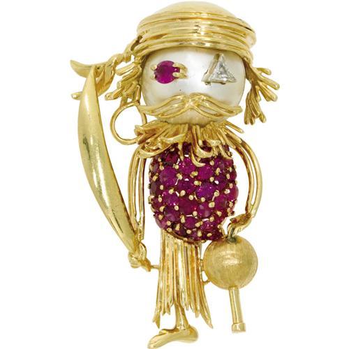 <B>Ruby, Diamond, Mabe Pearl, Gold Clip-Brooch,</B></I><BR><BR>The brooch, designed as a pirate, features round-cut rubies weighing a total of approximately 3.50 carats, enhanced by a mabe pearl, accented by a triangle-cut diamond weighing approximately 0.08 carat, set in 18k yellow gold. A clip mechanism completes the reverse. Circa 1950. Gross weight 22.00 grams.<BR><I>Dimensions: 2 inches x 1-1/4 inches</B></I><BR><BR><b>Shipping:</b> Miscellaneous Collectibles, Smal (<a target="_blank" href="http://www.heritageauctions.com/common/shipping.php">view shipping information</a>)