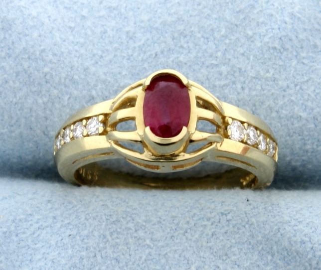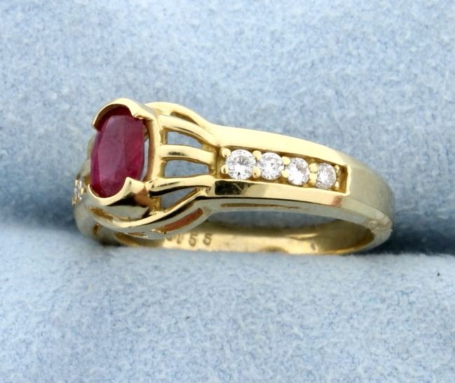 Fantastic looking Ruby and Diamond ring set in 14k yellow gold. The oval Ruby is 6.5mm x 4.12mm and weighs 0.65 carats--the gem is a true, very red color. There are also 8 diamonds that weigh a total of 0.18 carats. Size 6 1/2 4.1g
