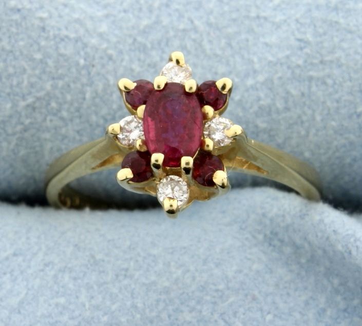 Beautiful gem Ruby ring with diamonds set in 14k yellow gold. The ring has an oval center Ruby, 6mm x 4mm, that weighs 0.45 carats and 4 AAA quality round gem Ruby's that weigh 0.26 carats. The 4 brilliant cut diamonds total 0.16 carats, SI clarity and G color--they sparkle bright and white! Size 7 1/2 3.2g