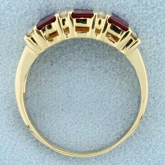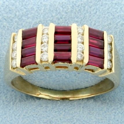 In 14K yellow gold. There are twelve 3.5x2mm emerald cut rubies- 1.00ct Total weight of beautiful color and clarity. Also sixteen .02ct high quality round diamonds. Size 9 1/2 5.4g