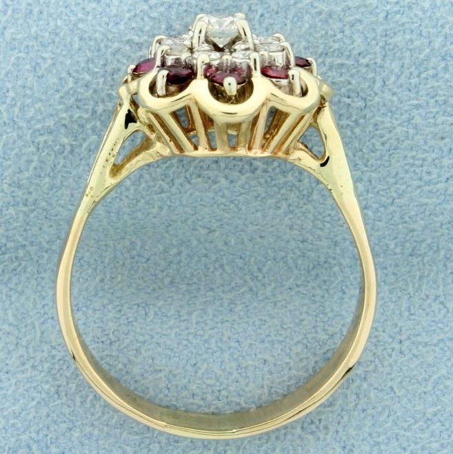 In 14K yellow gold. The center diamond is a .2ct round, surrounded by eight .04ct round diamonds - all very high quality VS clarity/G color. Also has eight 2.5mm round rubies, that have beautiful color and clarity! Size 10 3/4 6.2g