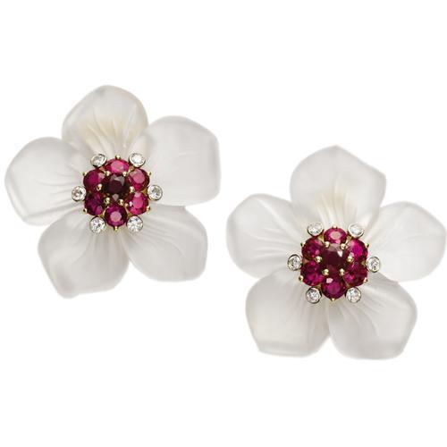 <B>Ruby, Diamond, Rock Crystal Quartz, Gold Earrings, Aletto Bros.</B></I><BR><BR>Each flower earring features full-cut diamonds weighing a total of approximately 0.18 carat, enhanced by round-cut rubies, accented by frosted rock crystal quartz petals, set in 18k yellow gold. Total diamond weight for the pair is approximately 0.36 carat. Total ruby weight for the pair is approximately 2.75 carats. Marked Aletto Bros. Gross weight 20.70 grams.<BR>*Note: earrings are designed with clip backs and cannot be converted to pierced.<BR><I>Dimensions: 1-1/4 inches</B></I> <B>Condition Report:</B> Earrings<BR><BR>Designer: Aletto Brothers<BR><BR>Diamonds: GHI<BR><BR>Average Clarity: VS<BR><BR>Shape: Round<BR><BR>Diamond Count: 1-25<BR><BR>Colored Gemstones: Ruby<BR><BR>Average Clarity: Good<BR><BR>Shapes: Round<BR><BR>Gemstone Count: 1-25<BR><BR>Overall Condition: Very Good<BR><BR>Notes: Frosted rock crystal petals. Beautifully made. Exquisite craftmanship.<BR><BR><BR><b>Shipping:</b> Miscellaneous Collectibles, Smal (<a target="_blank" href="http://www.heritageauctions.com/common/shipping.php">view shipping information</a>)