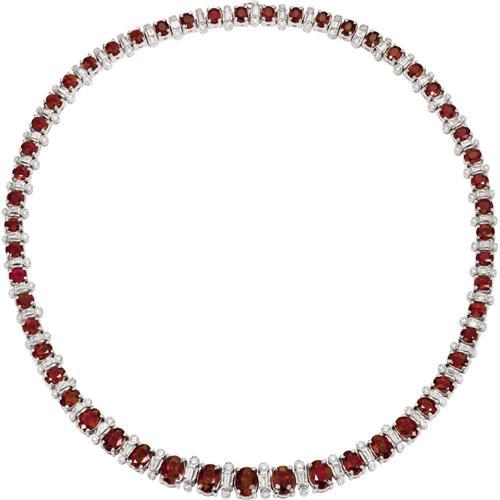 <B>Ruby, Diamond, White Gold Necklace</B></I><BR><BR>The graduated necklace features oval-shaped rubies weighing a total of approximately 35.00 carats, enhanced by full and tapered baguette-cut diamonds weighing approximately 7.00 carats, set in 18k white gold. Gross weight 79.20 grams.<BR><I>Length: 17 inches</B></I><BR><BR><b>Shipping:</b> Miscellaneous Collectibles, Smal (<a target="_blank" href="http://www.heritageauctions.com/common/shipping.php">view shipping information</a>)