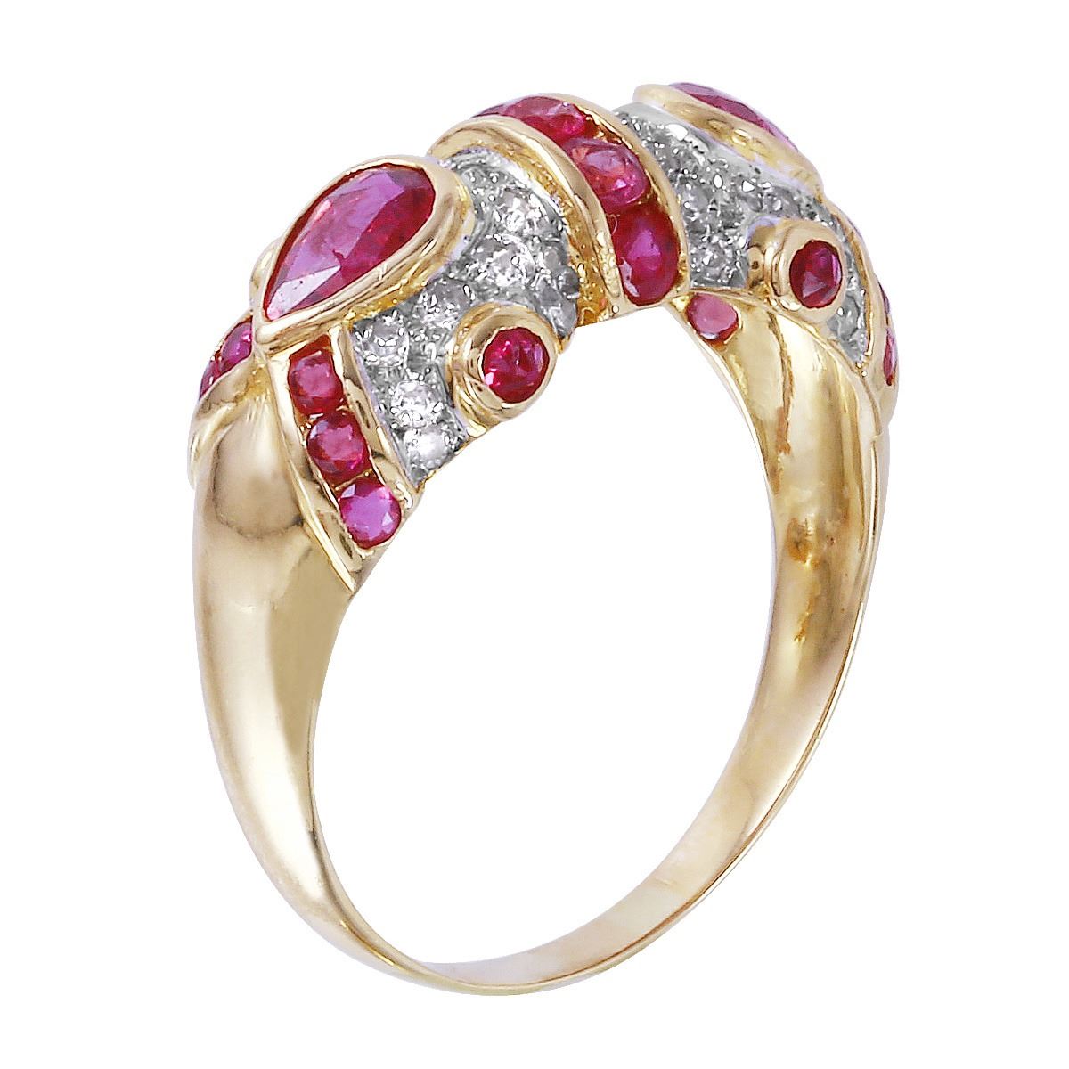 18KT yellow gold ring with a bright polish finish containing round cut rubies and round brilliant cut diamonds in a geometric design, atop a slim band.SpecificationsJewelry InformationCategory: RingCategory Style: GemstoneNew/Used: Pre-OwnedGender: FemaleRing Size: 8.5Metal: 18KT Yellow GoldTotal Weight: 4.69 GramsTotal Diamond Weight: 0.50ctwTotal Gemstone Weight: 1.52ctwTotal Weight all Stones: 2.02ctwInternal ID:1395Diamond 1Total Carat Weight: 0.50ctwClarity: SI1Color: H-IShape: Single CutCount: 40Gemstone 1Gemstone: RubyTotal Carat Weight: 0.50ctwCarat: 1.02ctwColor: RedShape: Pear modified Brilliant CutCount: 2Gemstone 2Gemstone: RubyCarat: 0.50ctwColor: RedShape: Round Brilliant CutCount: 21DisclaimersThe descriptions listed should not be construed as an appraisal. The detail is provided as a guideline for color, clarity, weights and measurements to the best of our ability. We welcome inspections. WE SHIP WORLDWIDE!This item has a Reserve established by our consigner.