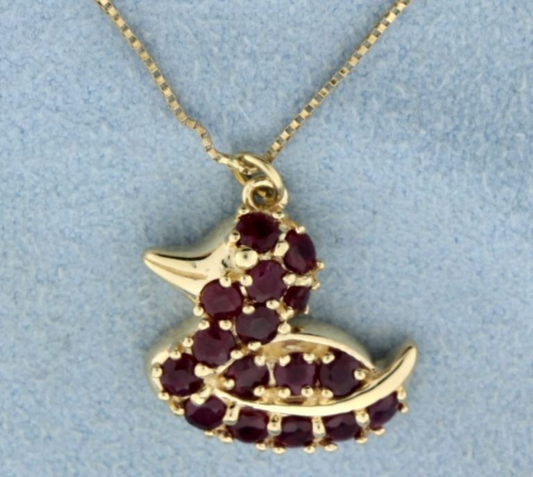 This darling 14k yellow gold duck pendant is covered with 14 round Rubies that total over 1 carat! The 14k yellow gold chain is 22" long.