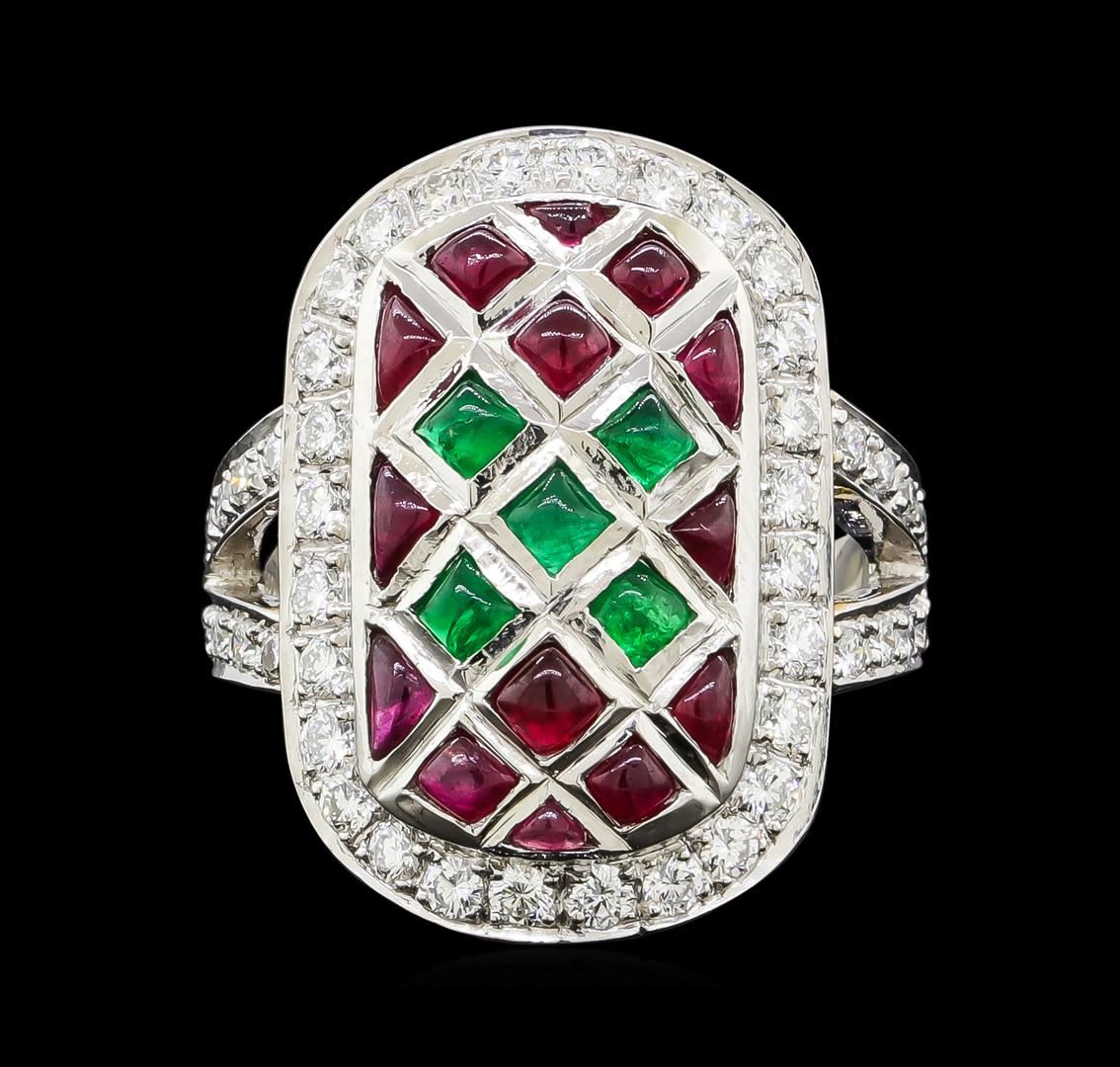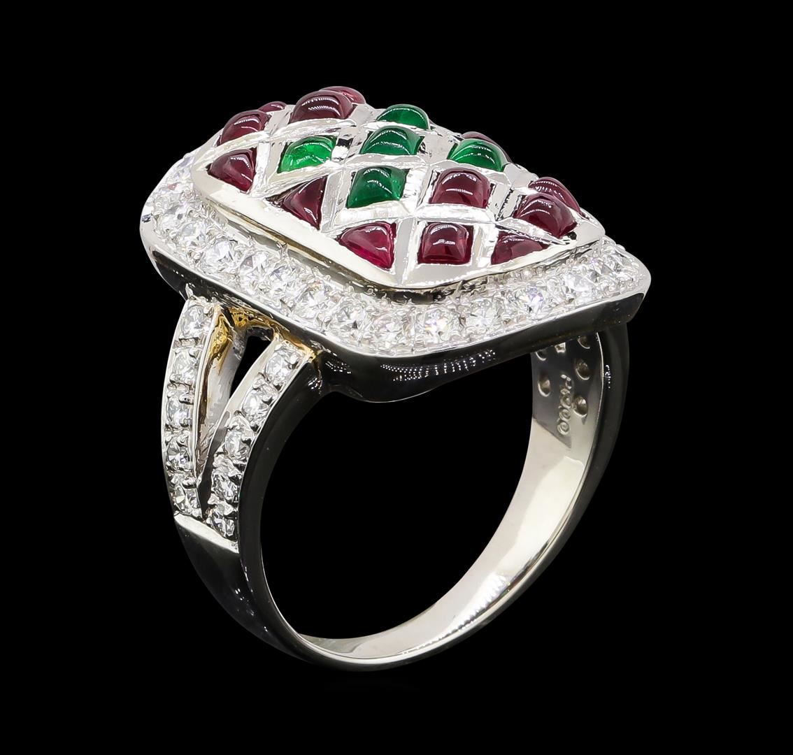 One ring featuring: Platinum containing Ruby, Emerald, and Diamonds. Total Weight of Ring: 9.6 grams.