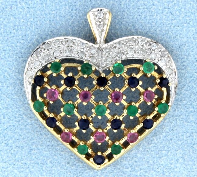 Beautiful 10k yellow gold heart shaped pendant with Ruby, Emerald and Sapphire gemstones and 26 diamonds that weigh a 1/4 carat. 5.0g NO CHAIN