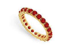 Emitting a vibrant red radiance this vivacious eternity band is prong-set with brilliant round rubies. Made in 14K yellow gold this eternity band has a total gem weight (TGW) of 2.00 ct. A perfect gift for any July born as Ruby is Julys birthstone.