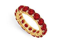 Emitting a vibrant red radiance this vivacious eternity band is prong-set with brilliant round rubies. Made in 14K yellow gold this eternity band has a total gem weight (TGW) of 5.00 ct. A perfect gift for any July born as Ruby is Julys birthstone.