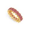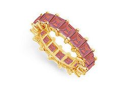 Emitting a vibrant red radiance this vivacious eternity band is prong-set with princess-cut rubies. Made in 14K yellow gold this eternity band has a total gem weight (TGW) of 5.00 ct. A perfect gift for any July born as Ruby is Julys birthstone.