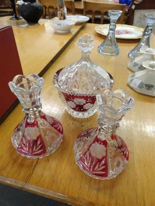 Ruby Flash to Clear Candle Holders & Candy Dish