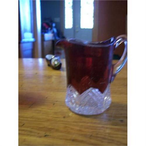 I have a few pieces of glass souvenier items from different towns and states.This is a Ruby flashed pitcher.It has "Thomas S.D.." written on it in gold.4 " tall.No cracks but a bit rough and small nicks on the rim of the base and some wear to the ruby flash.
