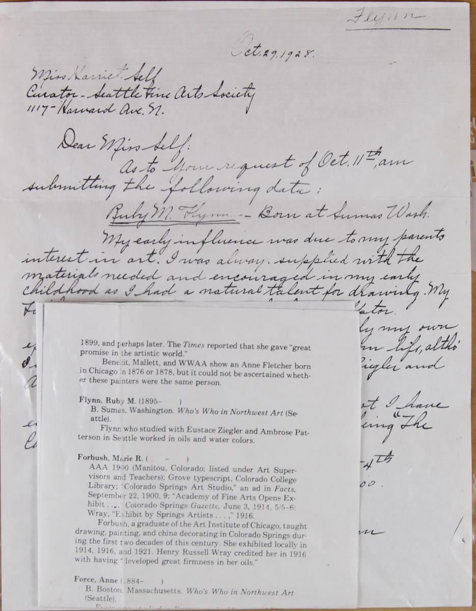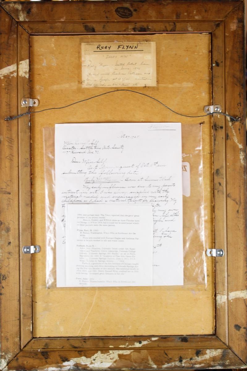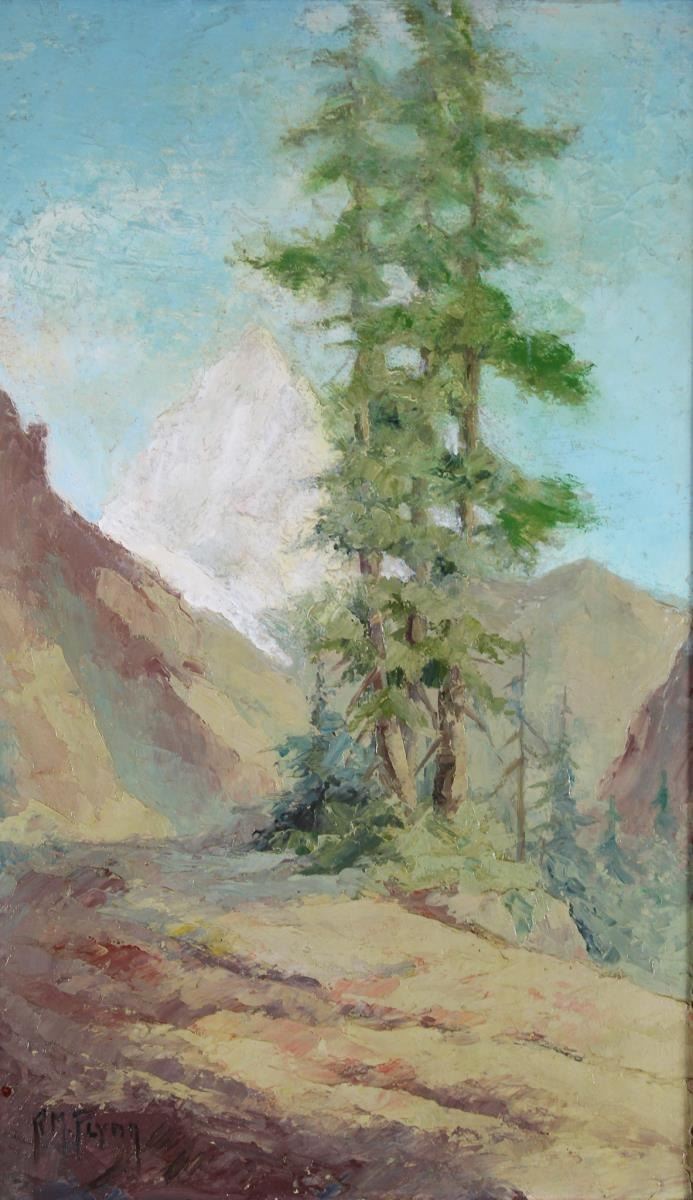 "Index Mountain" Washington State, vertical landscape of pine trees in the mountains. Oil on canvas, signed lower left. Ruby Flynn studied with Eustice Ziegler and Ambrose Patterson. She is listed in Who's Who in Northwest Art.