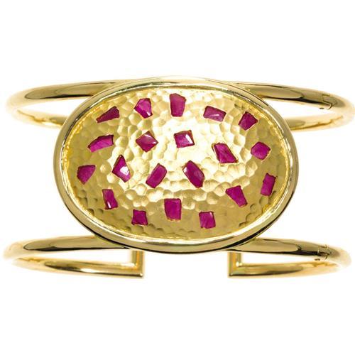 <B>Ruby, Gold Bracelet, Lunia</B></I><BR><BR>The bangle features a central shield-shaped plaque, enhanced by polished rubies of varying shape and size, flush set in hammer finished 18k yellow gold. A matte finished box clasp secures the bracelet. From the Coera Collection by Lunia. Gross weight 42.70 grams.<BR><I>Dimensions: 8 inches x 1-1/4 inches</B></I> <B>Condition Report:</B> Bracelet<BR><BR>Designer: Lunia<BR><BR>Colored Gemstones: Ruby<BR><BR>Average Clarity: Good<BR><BR>Shapes: Other<BR><BR>Gemstone Count: 1-25<BR><BR>Notes: Excellent Condition. Rubies have pinkish-purple-red color and are very lively. Weight of rubies is indeterminable.<BR><BR><BR><b>Shipping:</b> Miscellaneous Collectibles, Smal (<a target="_blank" href="http://www.heritageauctions.com/common/shipping.php">view shipping information</a>)
