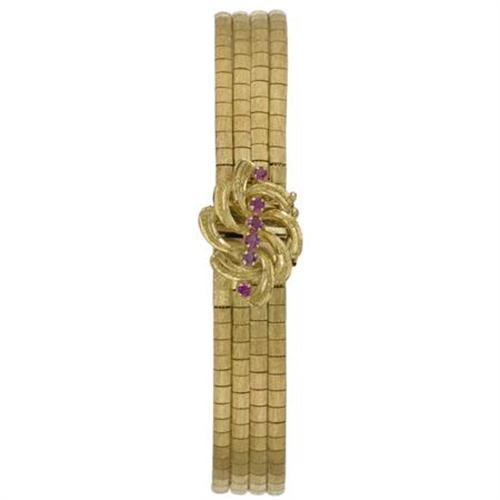 <B>Ruby, Gold Bracelet</B></I><BR><BR>The bracelet features round-cut rubies weighing a total of approximately 0.30 carat, set in 18k yellow gold, stationed by four spaghetti chains in 18k yellow gold. Gross weight 30.80 grams. <BR><I>Dimensions: 7-3/4 inches x 7/16 inch</B></I> <B>Condition Report:</B> Good condition.<BR><BR><b>Shipping:</b> Miscellaneous Collectibles, Smal (<a target="_blank" href="http://www.heritageauctions.com/common/shipping.php">view shipping information</a>)