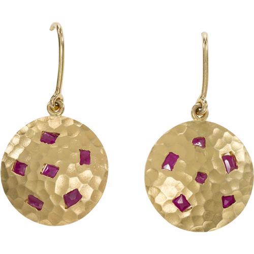 <B>Ruby, Gold Earrings, Lunia</B></I><BR><BR>Each earring features polished rubies of varying shape and size, set in hammer finished 18k yellow gold. From the Coera Collection by Lunia. Gross weight for the pair is 10.80 grams.<BR>*Note: earrings are designed for pierced ears.<BR><I>Dimensions: 1-1/2 inches x 3/4 inch</B></I> <B>Condition Report:</B> Earrings<BR><BR>Colored Gemstones: Ruby<BR><BR>Shapes: Other<BR><BR>Gemstone Count: 1-25<BR><BR>Notes: Good Condition<BR><BR><BR><BR><b>Shipping:</b> Miscellaneous Collectibles, Smal (<a target="_blank" href="http://www.heritageauctions.com/common/shipping.php">view shipping information</a>) <BR><BR><B>Important notic