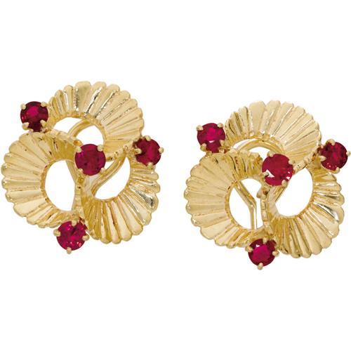 <B>Ruby, Gold Earrings</B></I><BR><BR>Each ribbon style earring features round-cut rubies, set in 14k yellow gold. Total ruby weight for the pair is approximately 1.50 carats. Gross weight 9.70 grams.<BR>*Note: earrings are designed for pierced ears but are easily converted.<BR><I>Dimensions: 3/4 inch</B></I> <B>Condition Report:</B> Earrings<BR><BR>Colored Gemstones: Ruby<BR><BR>Average Clarity: Good<BR><BR>Shapes: Round<BR><BR>Gemstone Count: 1-25<BR><BR>Overall Condition: Very Good<BR><BR>Notes: Rubies are bright and cheery. Earrings have posts with omega backs.<BR><BR><BR><b>Shipping:</b> Miscellaneous Collectibles, Smal (<a target="_blank" href="http://www.heritageauctions.com/common/shipping.php">view shipping information</a>) <BR><BR><B>Importan