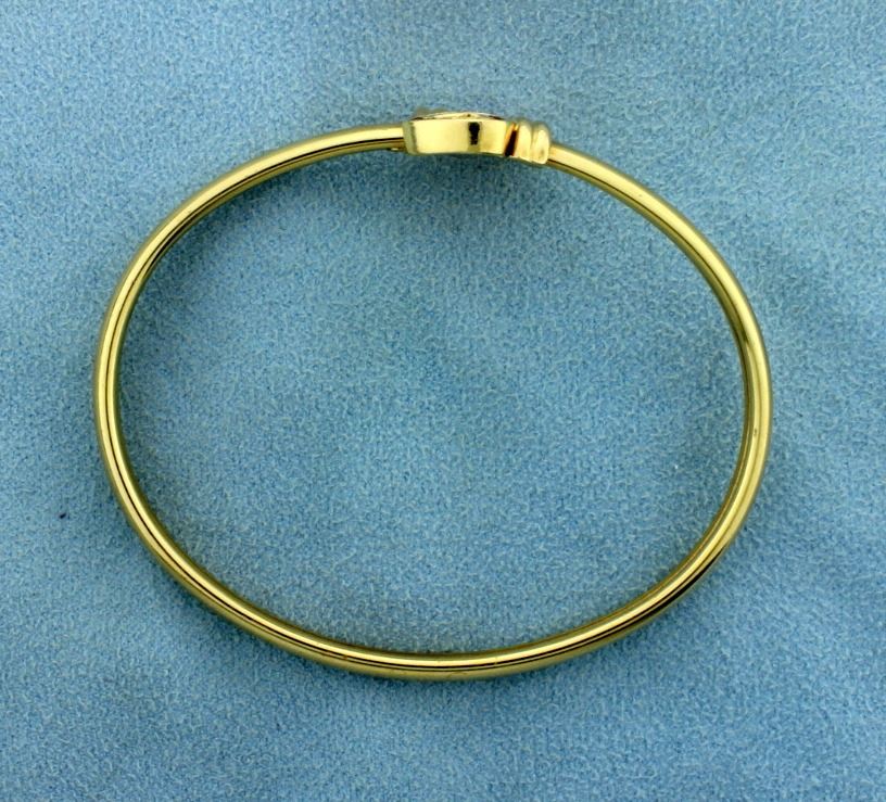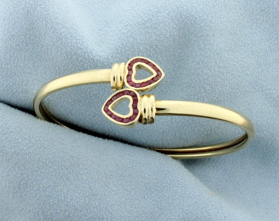 The bangle is 14K yellow gold and contains twenty eight 1.5mm round rubies that have great color! It is 2 1/2 inches in diameter, and the hearts swing apart for easy open/close. 8.1g