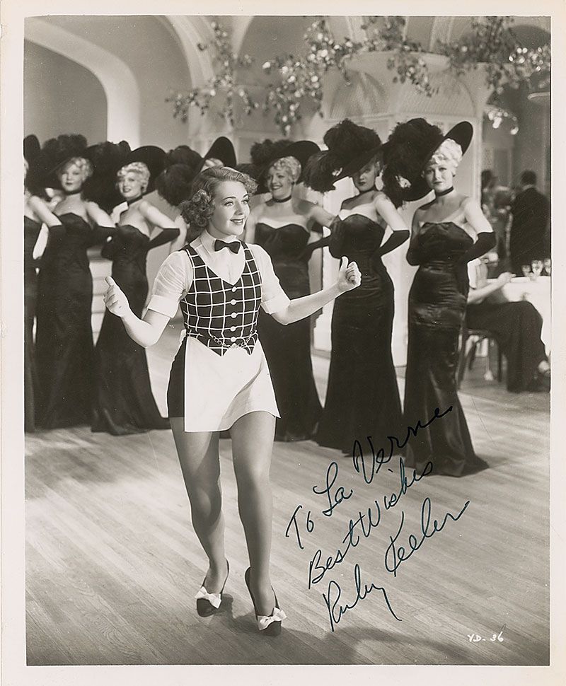 Glossy 8 x 10 photo of Keeler dancing, signed and inscribed in black felt tip, “To La Verne, Best Wishes, Ruby Keeler.” In fine condition, with binder dings to the left edge.