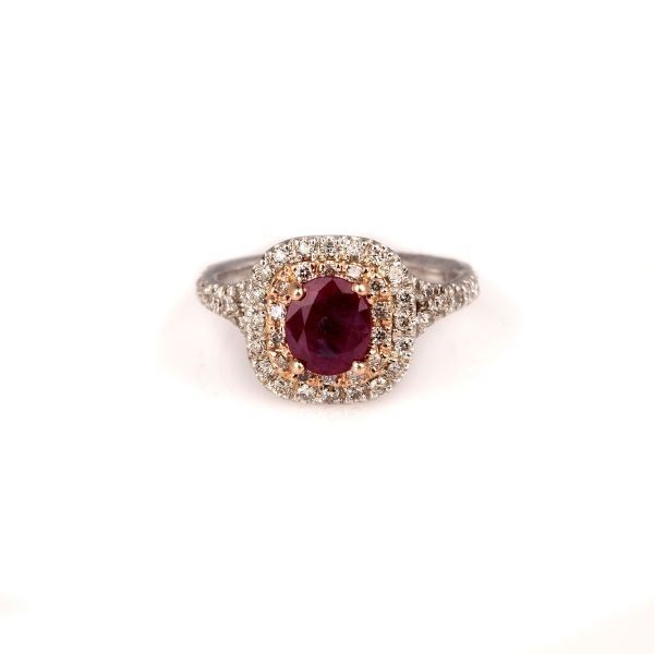 Oval ruby 1.25ct, round diamond 0.55ct (58)Two tone gold wg/yg 5.03grams 14k