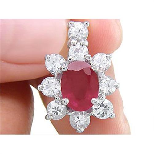 Nice pendant with a 2 1/4 cwt oval ruby and 2 1/2 cwt of round cut white sapphires set in 3.7 grams of 14kt yellow gold.The ruby is fine in clarity and extra fine in color. The white sapphires are extra fine in color and clarity. Shipped in a gift box.
