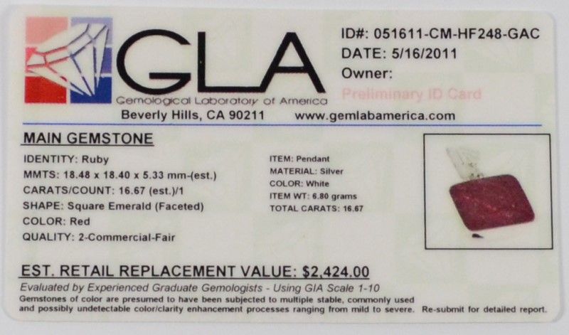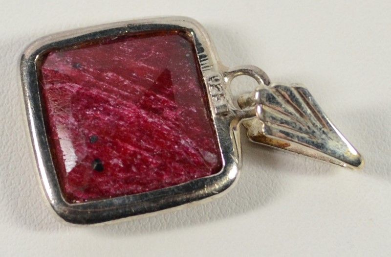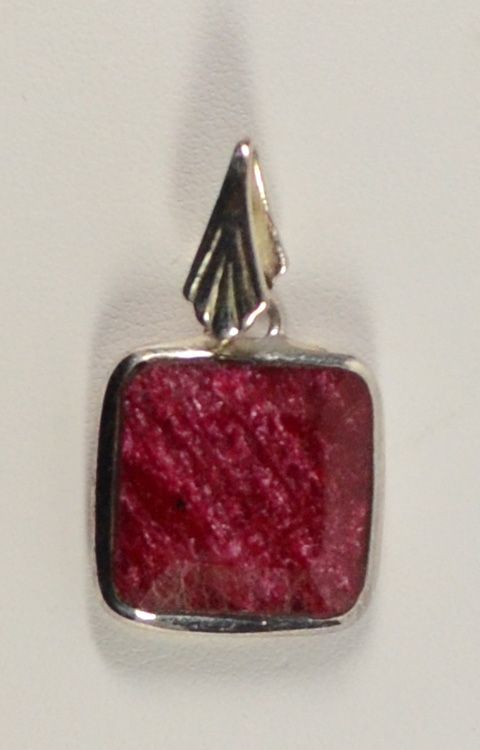 This is a Rough Cut Ruby set in .925 Sterling Silver Pendant. Emerald Cut Stone is a beautiful shade of natural red. 16.67 carats & weighs 6.8 grams. Gemological Laboratory of America estimates value at $2424.00. (Includes Paperwork)