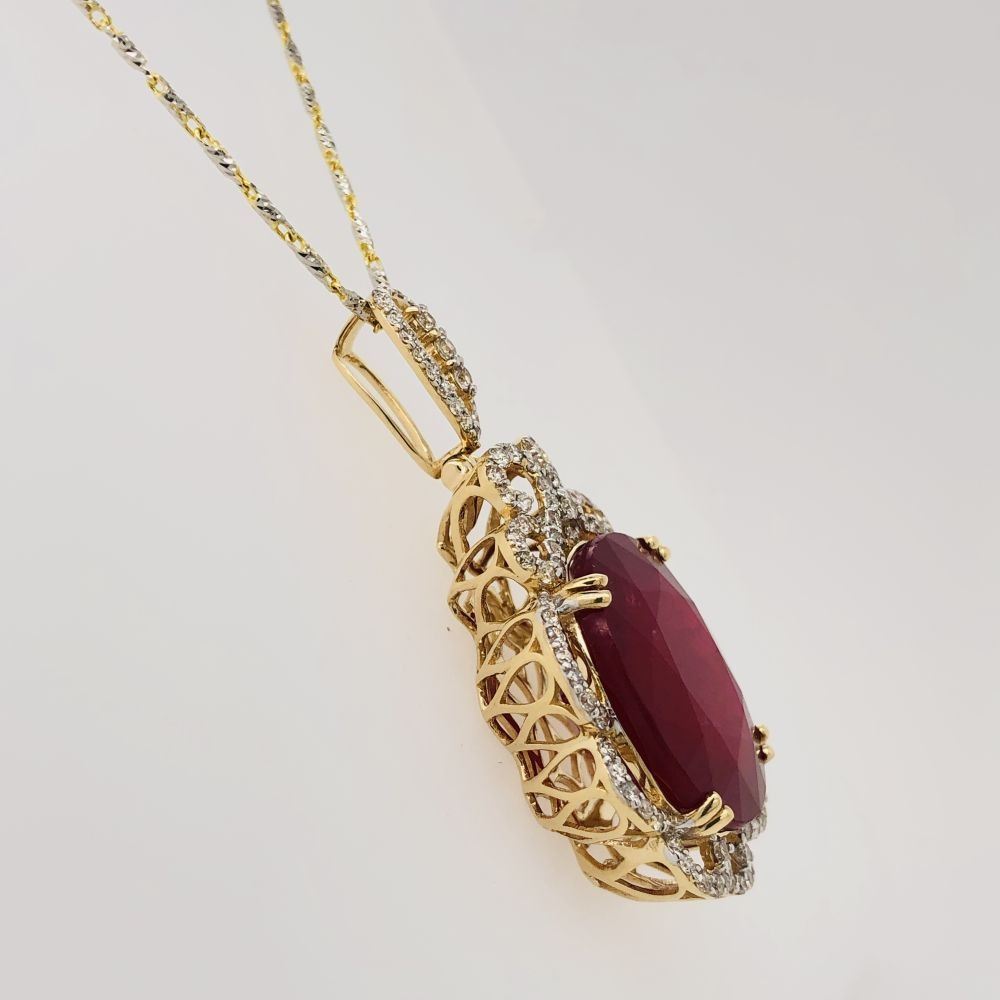 Genuine Ruby (Treated) and Earth-Mined Diamond Pendant.& nbsp; This Oscar Friedman 14 karat yellow and white gold ruby necklace will complete the set.& nbsp; A 24.27 carat oval-cut, bright red ruby is double-prong set with .85 carats of round, brilliant-cut, H-I color, VS2-SI clarity diamonds in the swirling, scalloped diamond frame and hinged bail.& nbsp; The pendant is set in a supportive ornate basket and hangs from a 14 karat white and yellow gold swivel link chain that is 18& quot; long with a lobster& nbsp; clasp.& nbsp; This necklace is certified and appraised for $13,710.00& nbsp; estimated retail replacement value.& nbsp; CHECK OUT THE INCREDIBLE RUBY JEWELRY IN LOTS 142,143, AND 144 TO CREATE A SUITE!!!
