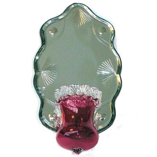 This is a lovely antique sconce made of hand-blown ruby red glass and etched mirrored glass. Believed to date from the mid to late 19th century. Rim of the candle holder features a pretty ruffled shape. Condition is excellent. Original silvering is intact. No visible cracks, chips or restorations. Some minor scratches to the mirror surface. Rear has its original hanging hook. Some corrosion to the mount but it's not noticeable behind the candle socket.