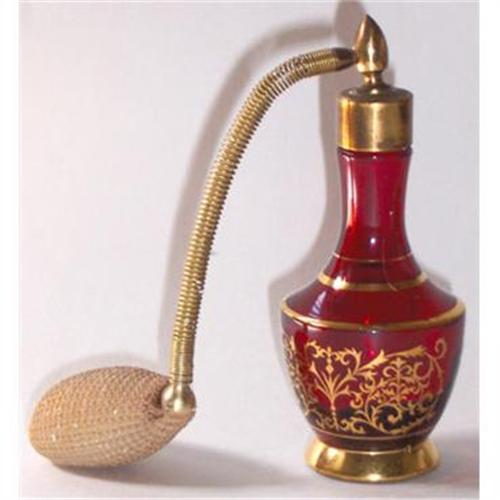 <tr><td>Title:Ruby Red Gold Trimmed Perfume Atomizer</td></tr>