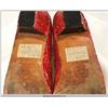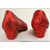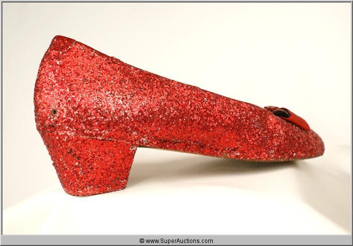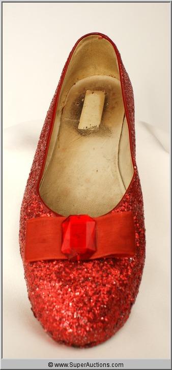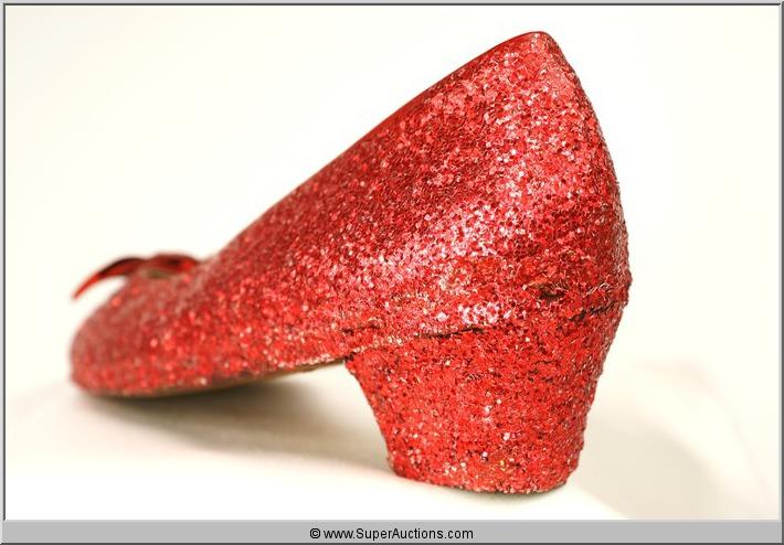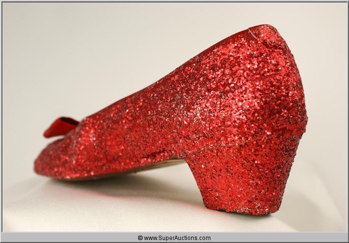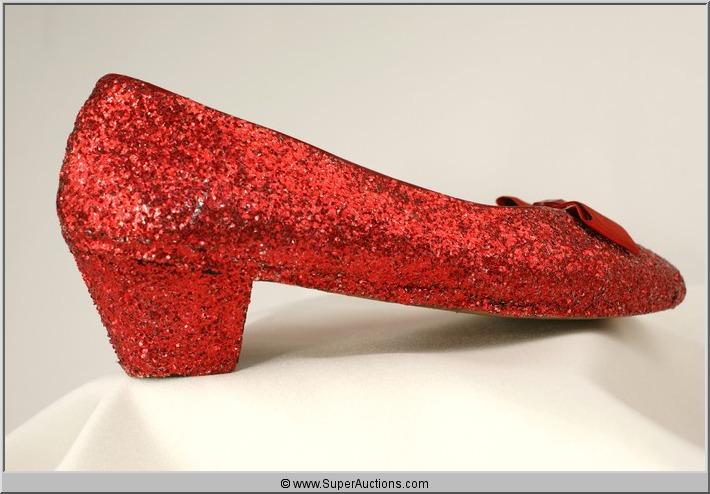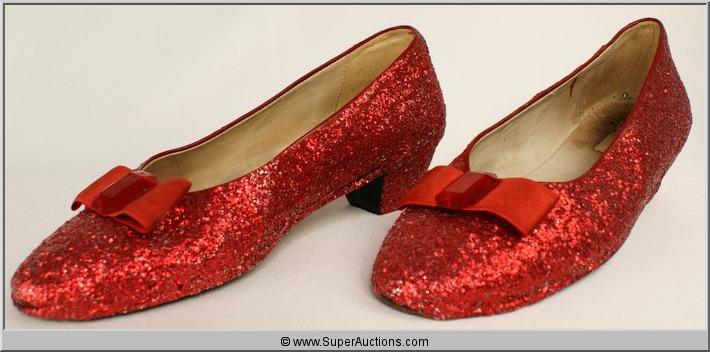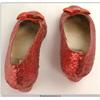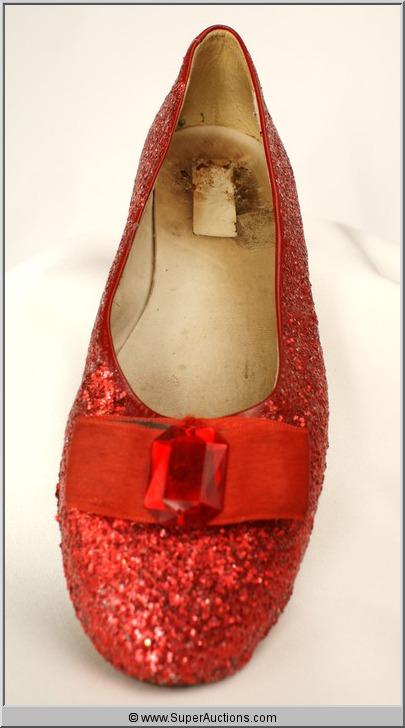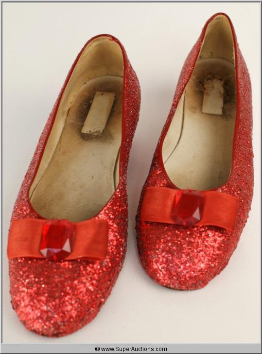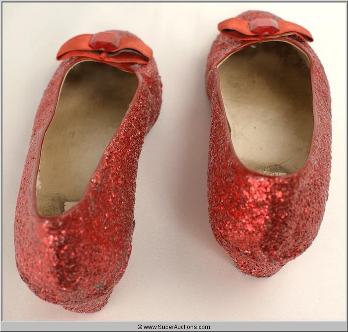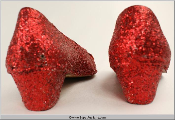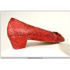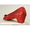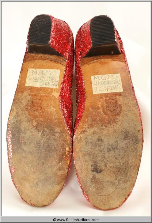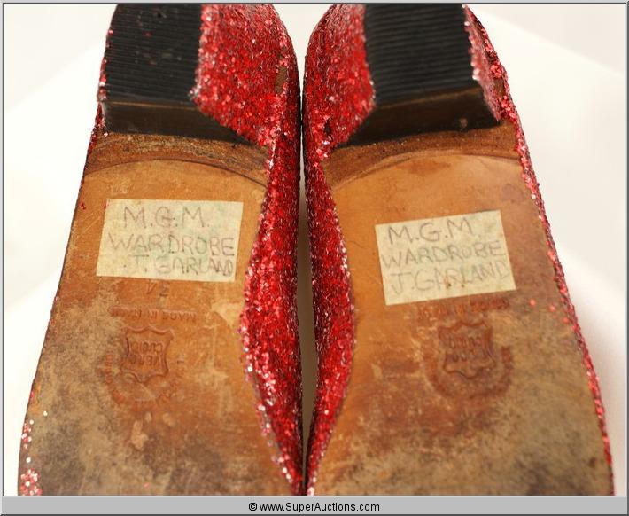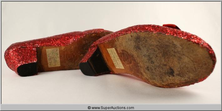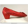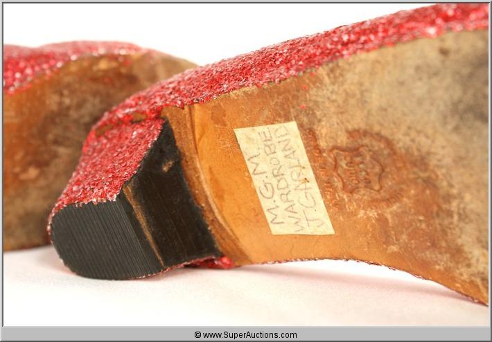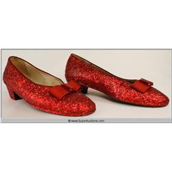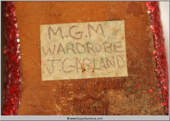 The Wizard of Oz 1939 Ruby Red Slippers. Italian Leather Shoes. Size 34. Lavorazione Artigiana Vero Cuoio. There is a piece of masking tape on the bottom of each shoe which states "MGM Wardrobe J. Garland." The shoes are coated in red glitter. The origin and former use cannot be authenticated.