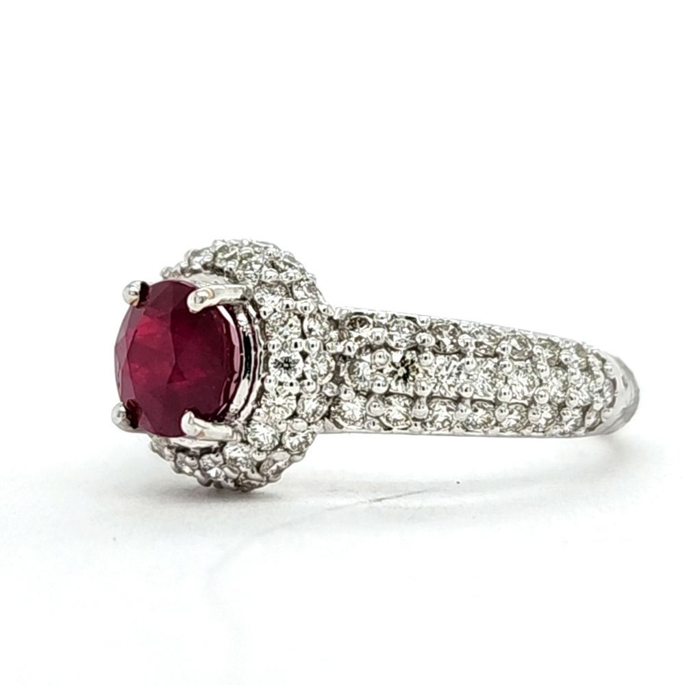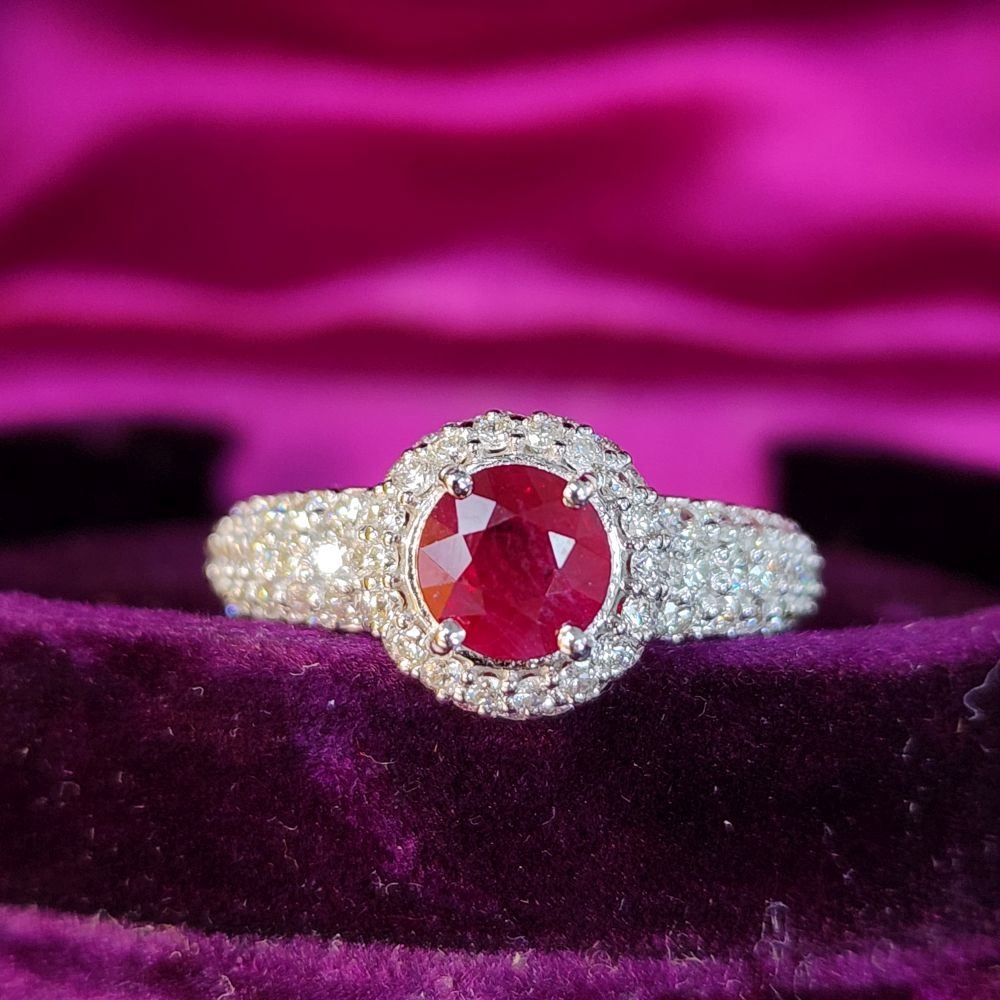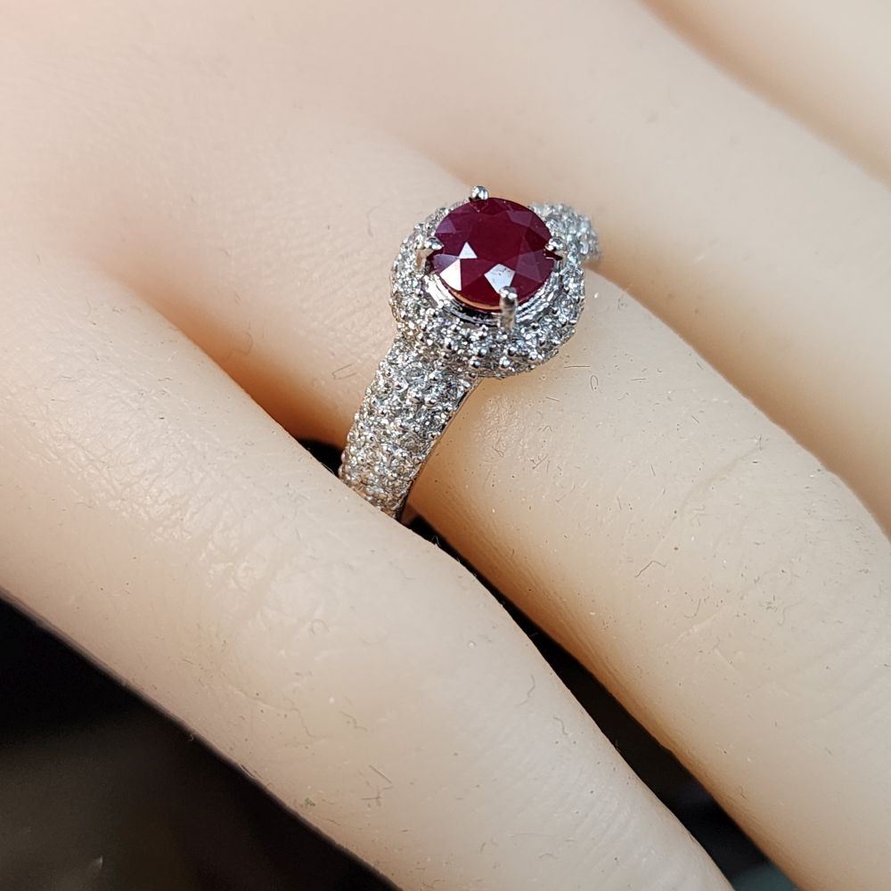 Genuine Ruby and Earth-Mined Diamond Ring.& nbsp; Quite the sparkler!& nbsp; This 14 karat white gold ring features a 1.23 carat round, faceted deep red ruby that is prong-set with .94 carats of round, brilliant-cut, I-J color, SI clarity diamonds in the tiered halo and rounded shoulders.& nbsp; The ring is US size 6.75 and has an approximate 2.4 mm shank.& nbsp; This ring can be resized for an additional $100, please allow an additional 10 days for shipping if we resize it.& nbsp; This ring is certified and appraised for $13,392.00 estimated retail replacement value.