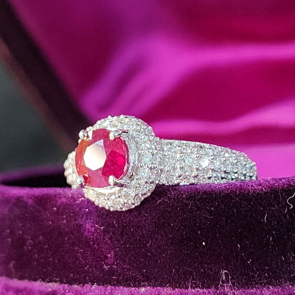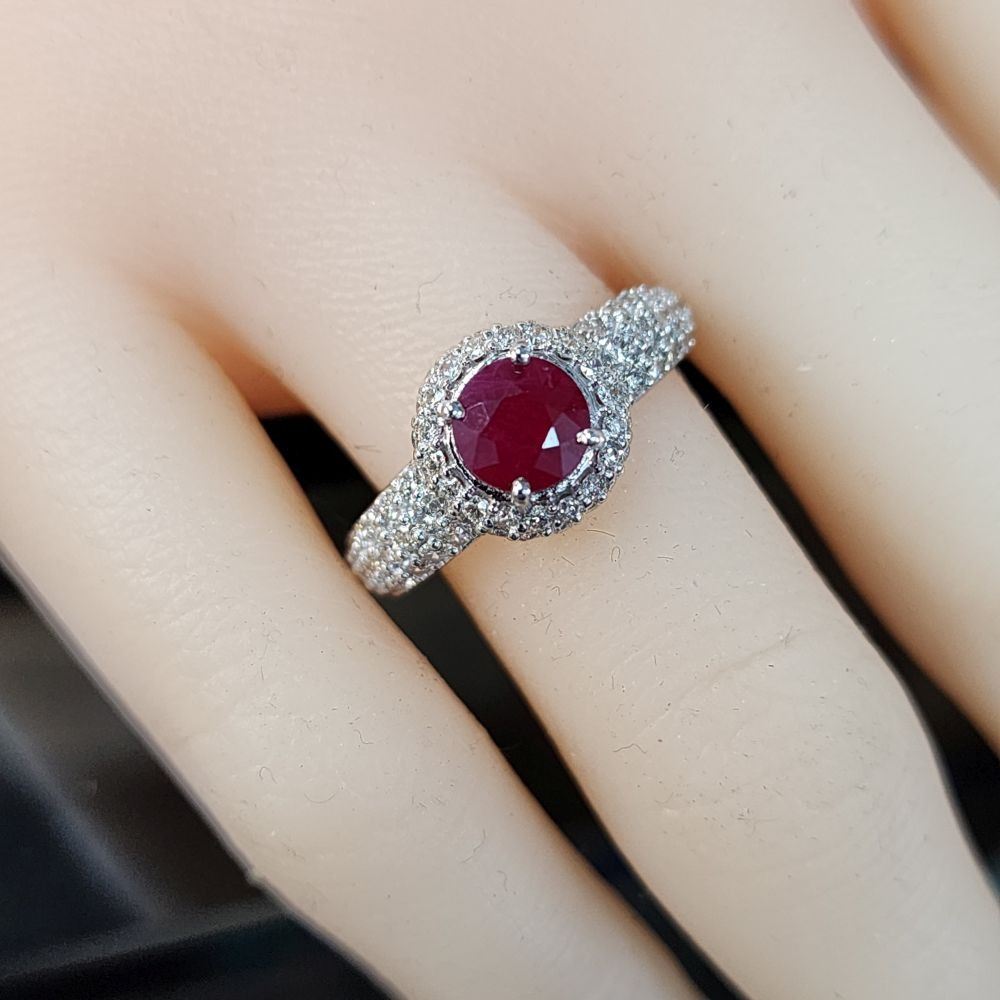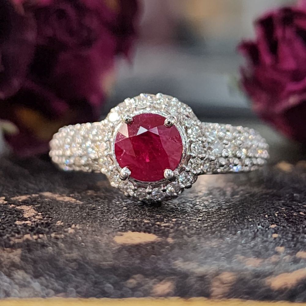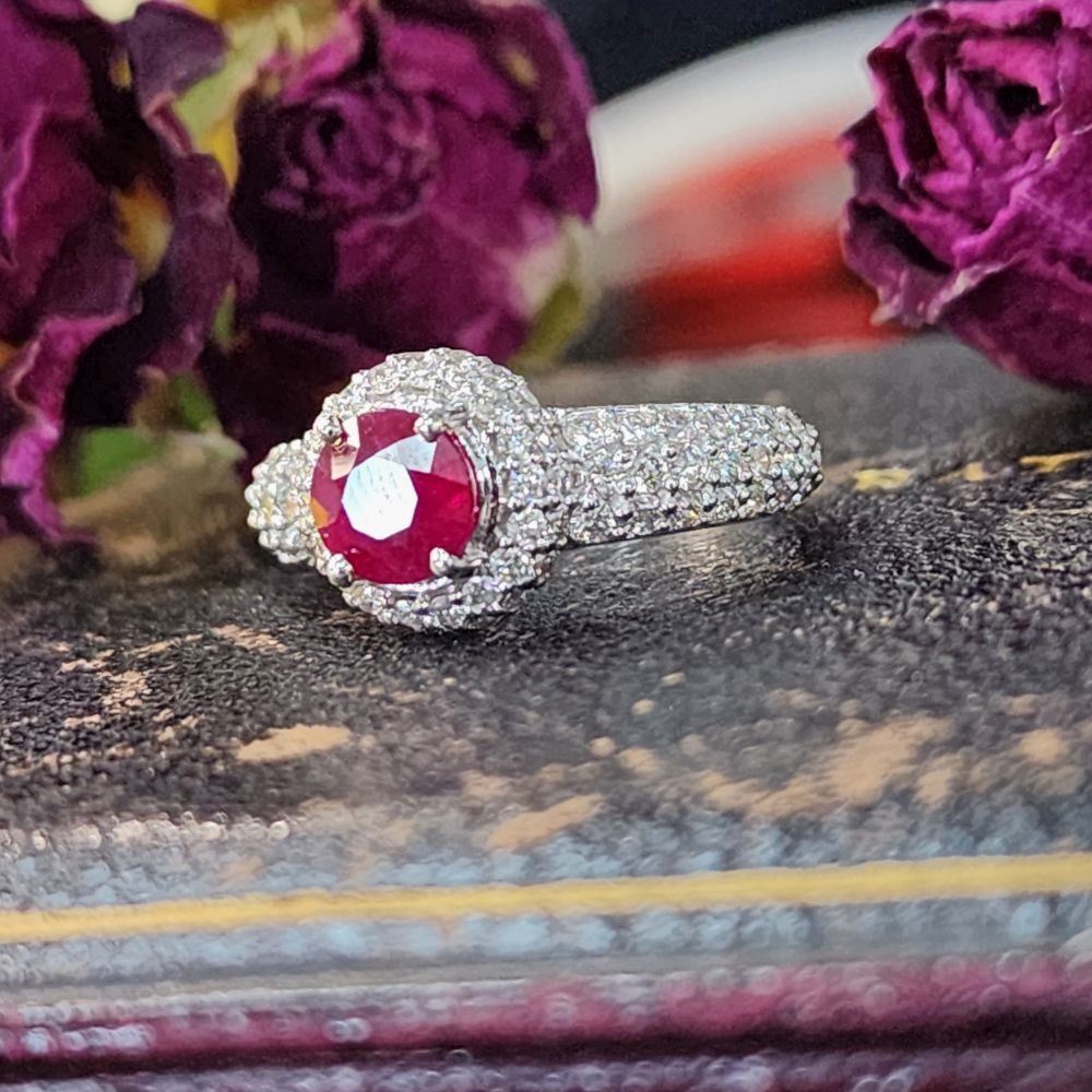 Genuine Ruby and Earth-Mined Diamond Ring.& nbsp; Quite the sparkler!& nbsp; This 14 karat white gold ring features a 1.23 carat round, faceted deep red ruby that is prong-set with .94 carats of round, brilliant-cut, I-J color, SI clarity diamonds in the tiered halo and rounded shoulders.& nbsp; The ring is US size 6.75 and has an approximate 2.4 mm shank.& nbsp; This ring can be resized for an additional $100, please allow an additional 10 days for shipping if we resize it.& nbsp; This ring is certified and appraised for $13,392.00 estimated retail replacement value.
