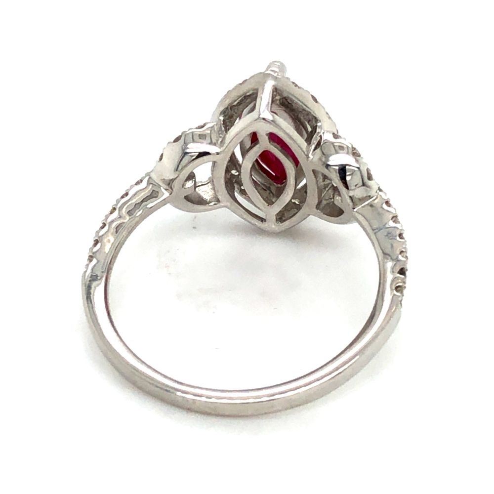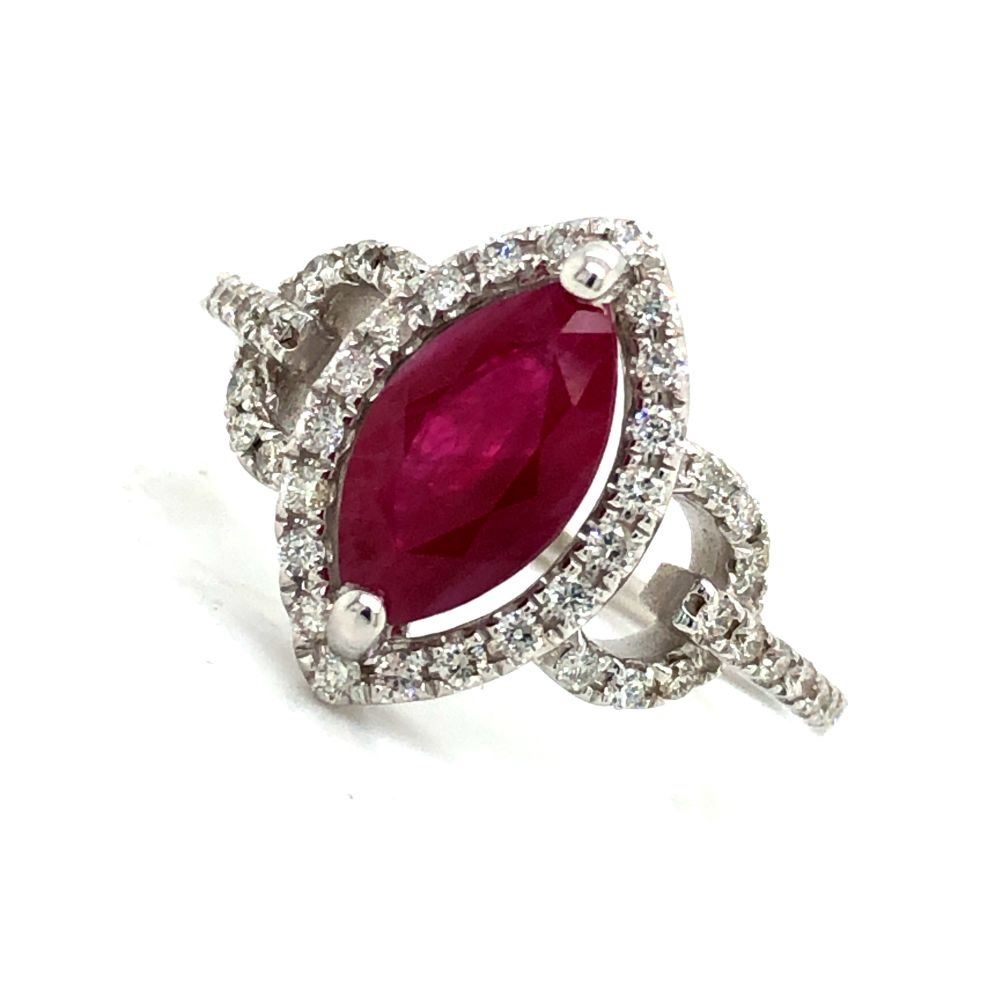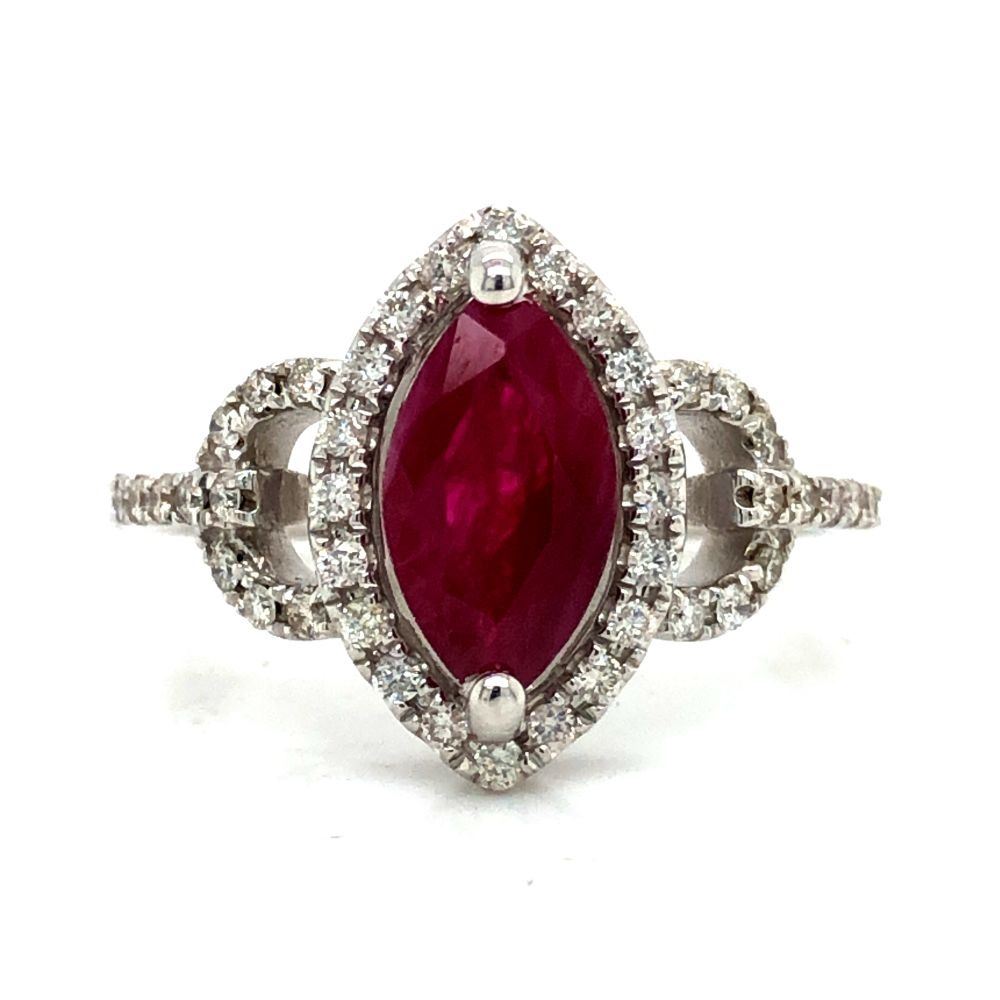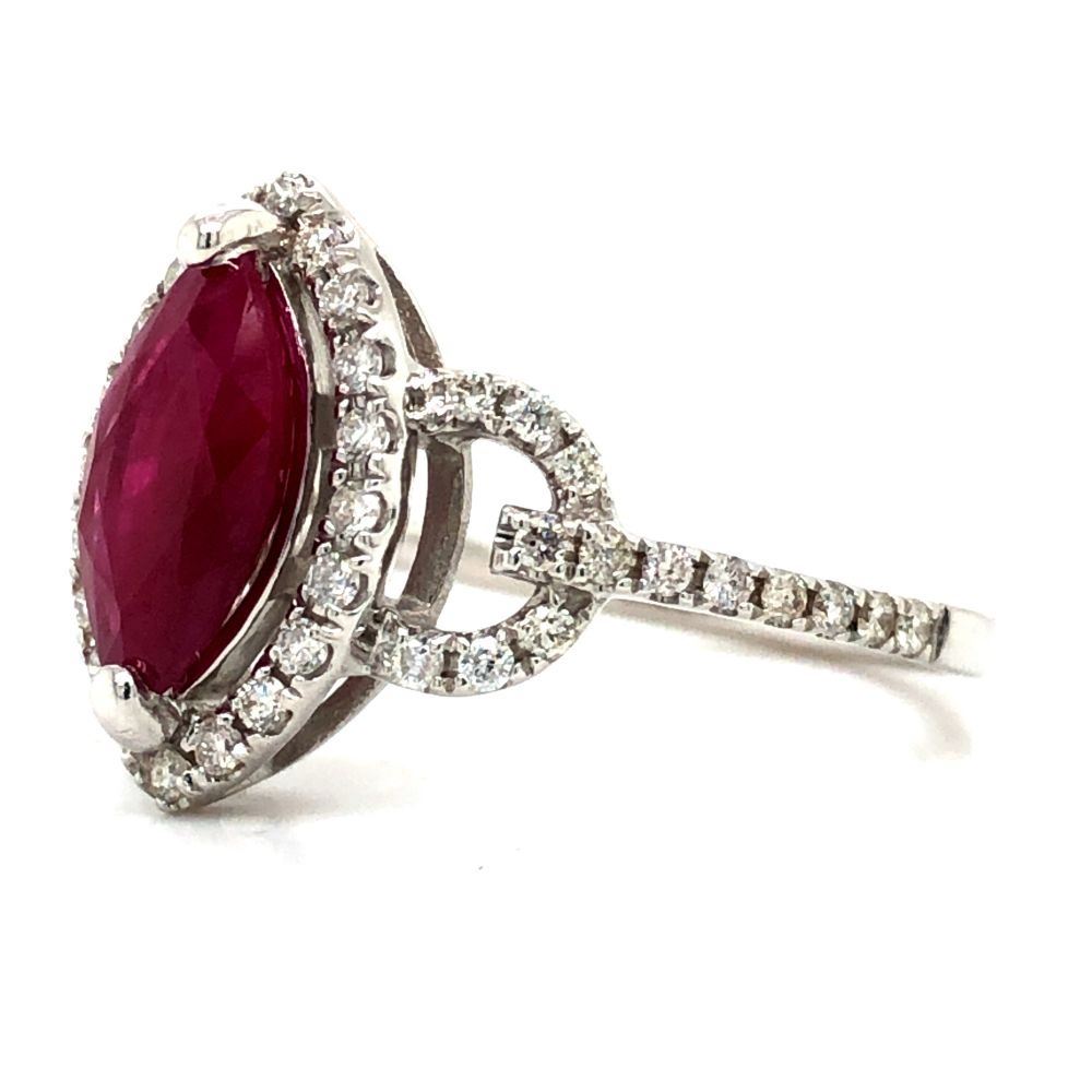 ADDITIONAL INFORMATION: A deep red ruby is prong-set in a white gold ring with round, brilliant-cut diamonds in the halo and on the shackle-like shoulders.& nbsp; The ring has a supportive under gallery and spans approximately 5/8& quot; on the finger.& nbsp; Although large and chunky jewelry is very trendy, if you prefer something a bit more demure, but with stylish elegance, this is a great choice!