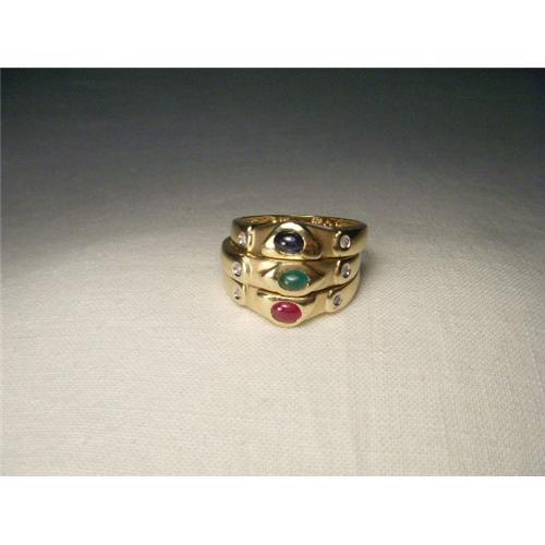 You are looking at a set of estate 14K yellow gold diamond and gemtone stacking rings. Each ring features a genuine cabochon sapphire, emerald, or ruby measuring 4 mm by 3 mm, sitting inbetween 2 brilliant round diamonds measuring 1 mm each. The rings are a size 6.5. The set weighs 5.9 grams. Sizing is available. They are in mint condition.
