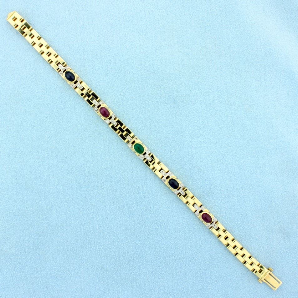 Ruby, Sapphire, Emerald, and Diamond Cabochon Bracelet
