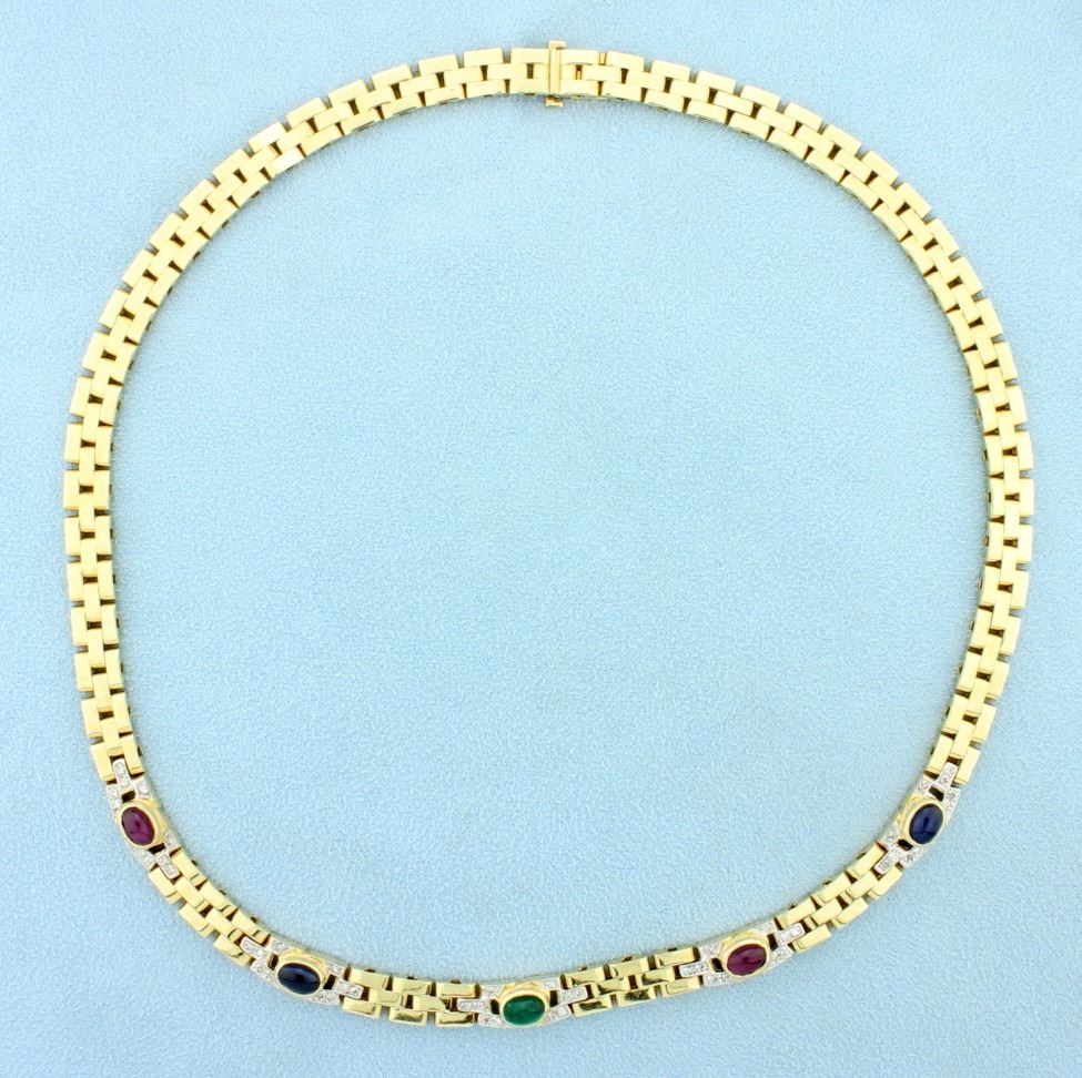 Ruby, Sapphire, Emerald, and Diamond Cabochon Necklace
