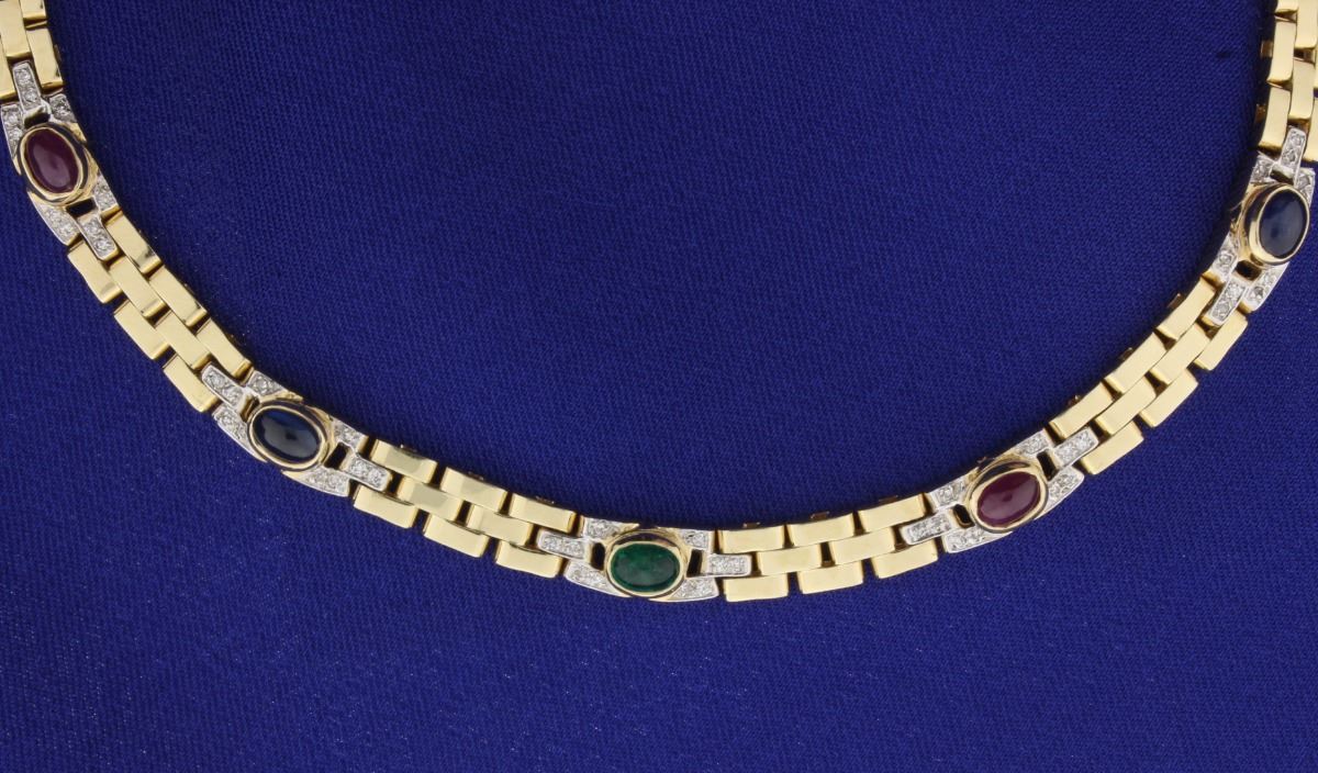 In 14K yellow gold, it is 16 1/4 inches long and contains two rubies, two sapphires & one emerald. All are 6x4mm oval cabochon gemstones with beautiful color! This necklace also contains fifty .01ct round diamonds. *look for matching bracelet! 47.8g