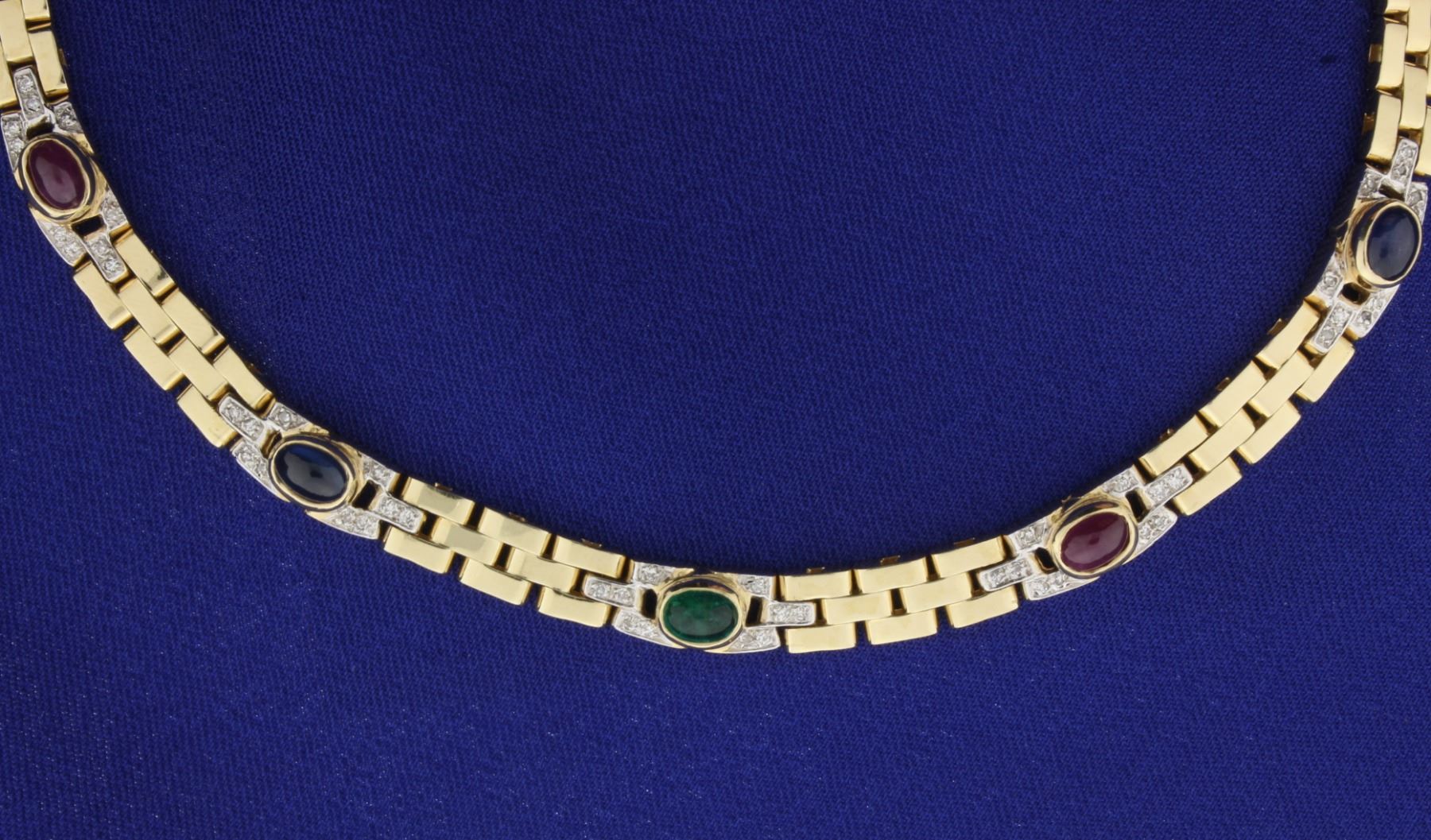 In 14K yellow gold, it is 16 1/4 inches long and contains two rubies, two sapphires & one emerald. All are 6x4mm oval cabochon gemstones with beautiful color! This necklace also contains fifty .01ct round diamonds. *look for matching bracelet! 47.8g