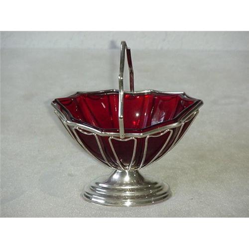 An early 20th century silver plated basket, 6 1/4" tall, 5 1/2" long, 3 3/4" wide, with a ruby glass liner. Great little piece to fill with sweets, the silverplate polishes beautifully and the glass is in perfect condition. No makers marks. (1)